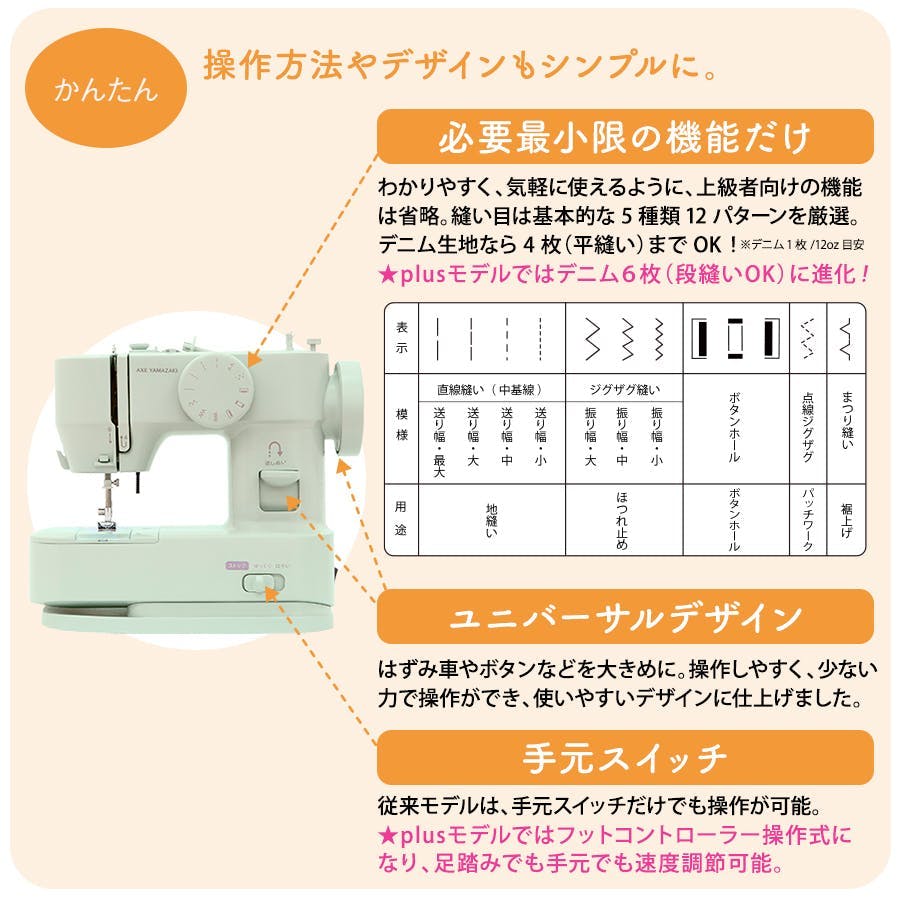 針穴糸通しスイングミシン©機構、LEDライト、水平釜式、フリーアーム、返し縫い、縫い模様5種類(12パターン)、電源2WAY式、【+plusモデルのみ機能】フットコントローラー操作、スピード無段階調節、低速でも最大パワー、デニム6枚重ねまでOK、針上自動停止、裾上げなどの段縫い(2枚→6枚→2枚)も可能(※送り長さ最大の場合)