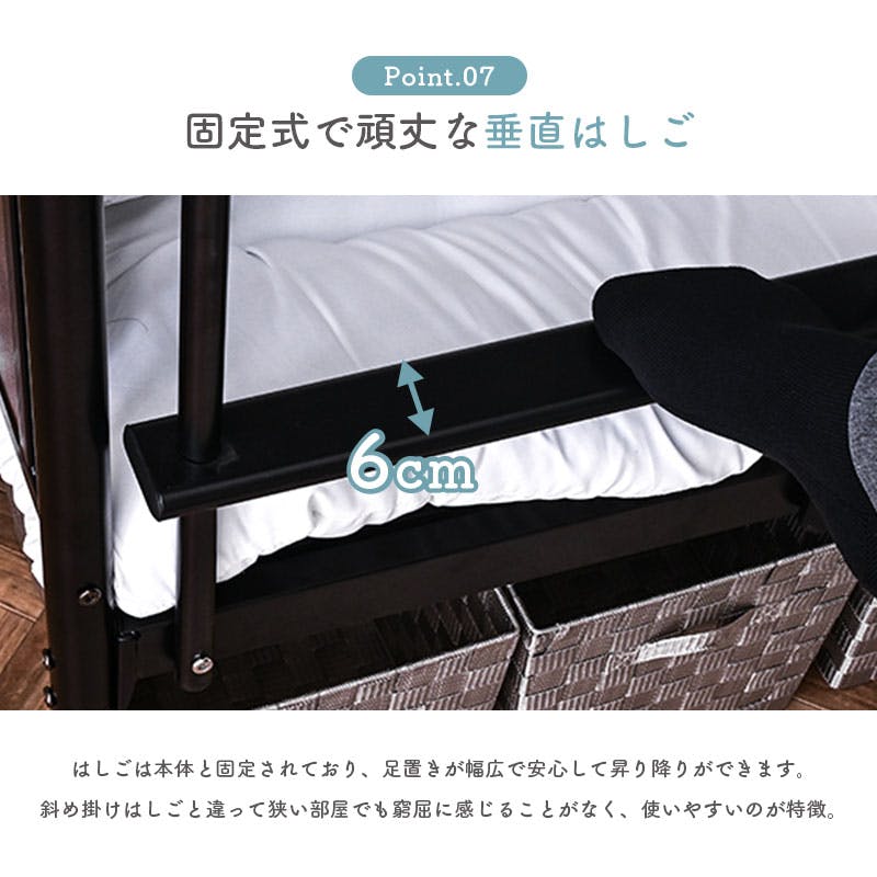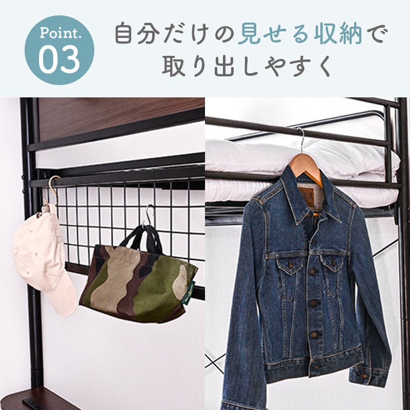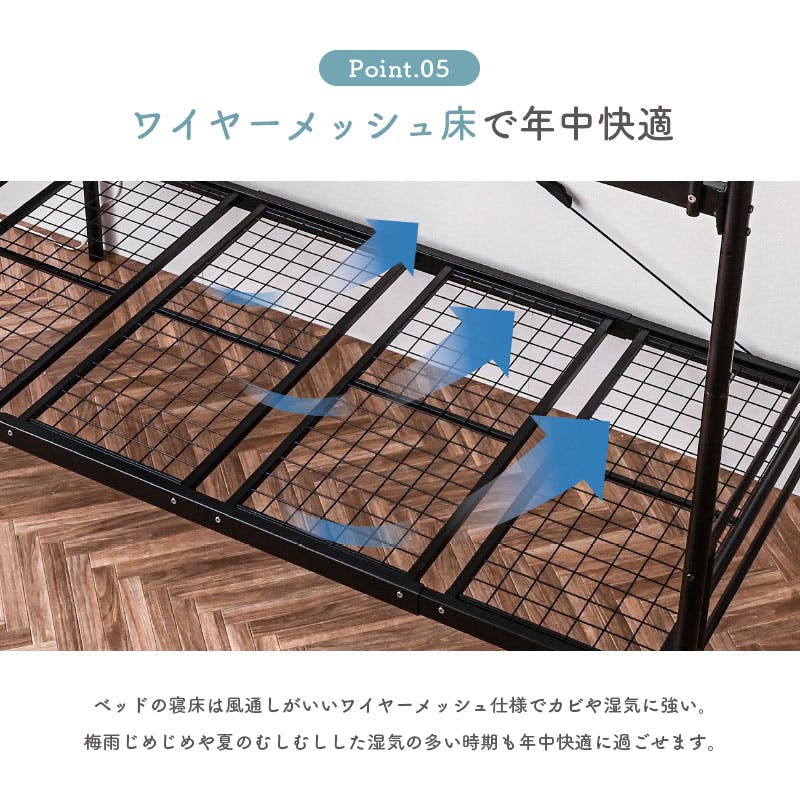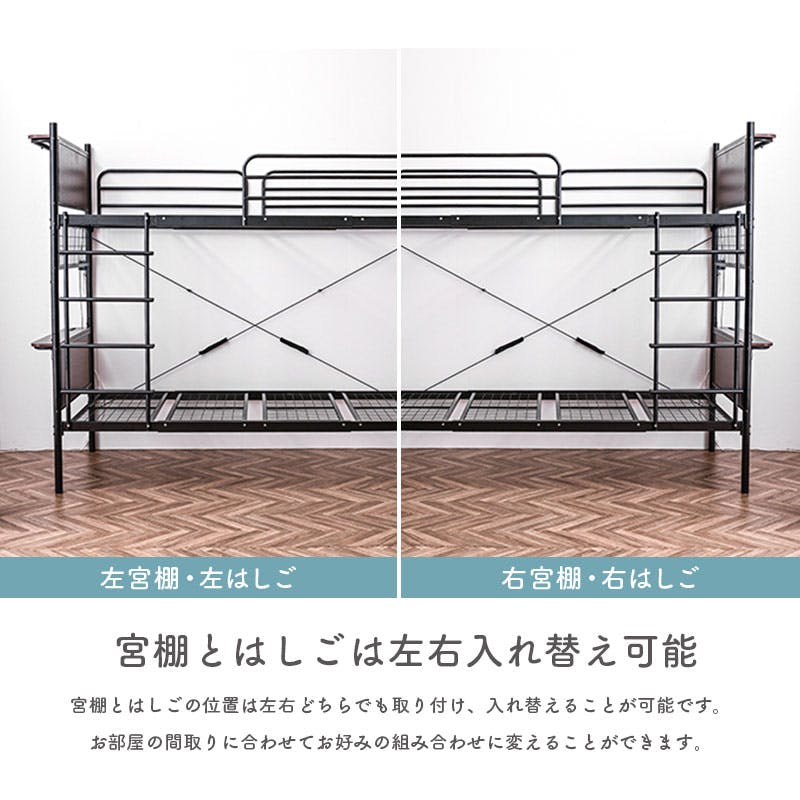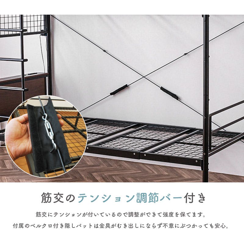 ISO認定工場で生産された安心品質。宮棚&コンセント、LED照明付きで便利。極太支柱とスチールパイプで高耐久・耐震性を実現。ワイヤーメッシュ床はサポートバー付きで強化。宮棚・はしごは左右入替OK。見せる収納や隙間活用も◎。シングル2台に分割可能で使い方自在。