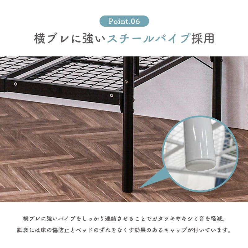 【ベッド】スチール(粉体塗装),【宮棚】強化紙化粧繊維板,傷防止キャップ付き