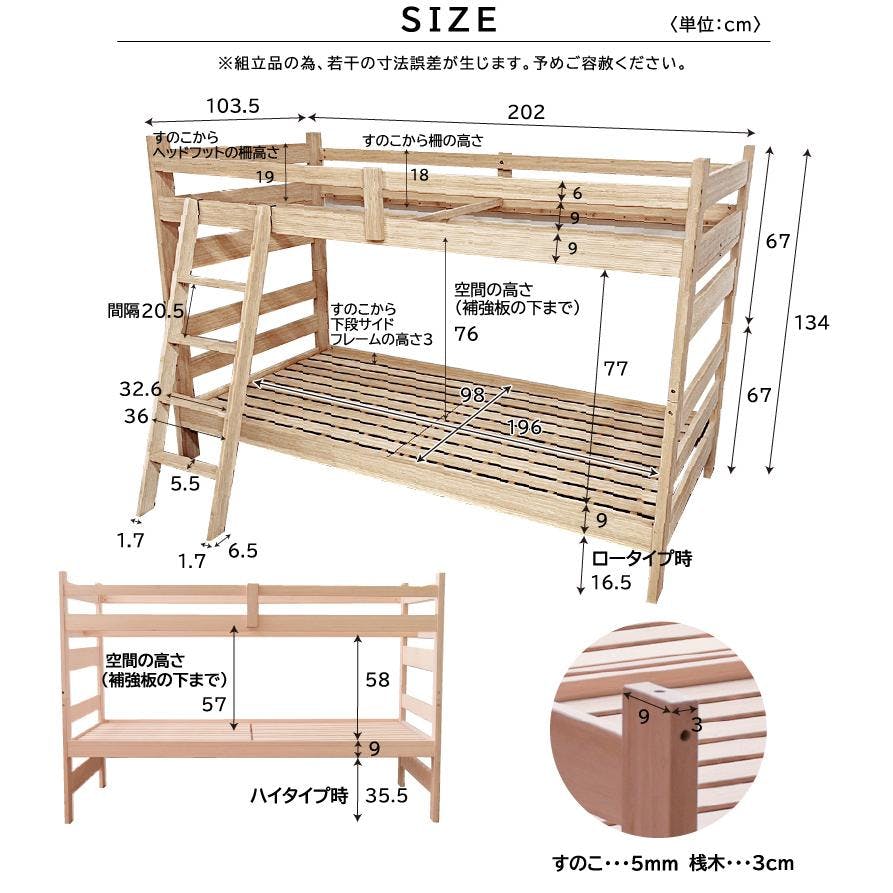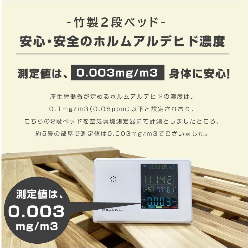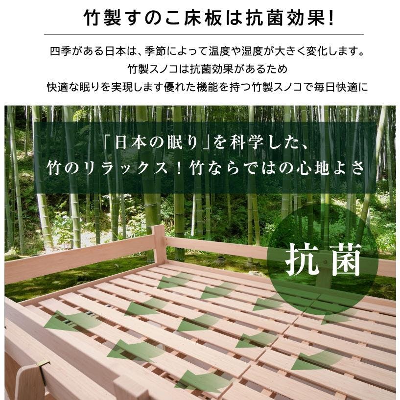 強度は木の約3倍、竹100%使用の高耐久ベッド。耐荷重500kgで大人も安心。高さ134cmのロータイプ設計で圧迫感を軽減。下段は2段階高さ調整可能。竹製すのこ床板は通気性に優れ、季節を問わず快適。カーボンニュートラル素材で環境にもやさしく、将来はシングルベッドとして分割可能。