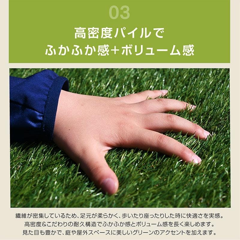 超高密度47万本/m²のふわっと心地よい人工芝。耐UV・耐候性で色あせに強く長持ち。EU認定の安心品質でお子様やペットもOK。リアルな色味の細パイルで自然な見た目を再現。裏面は抜けにくい2層ラテックス仕上げ。ロールタイプで広い面積も簡単施工、自由にカット可能。