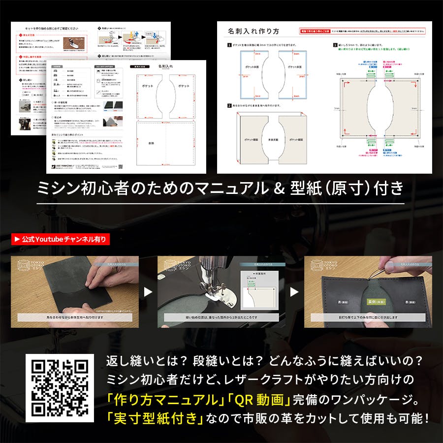 革1枚(国産栃木レザー使用)、試し縫い革1枚、作り方マニュアル、実物大型紙