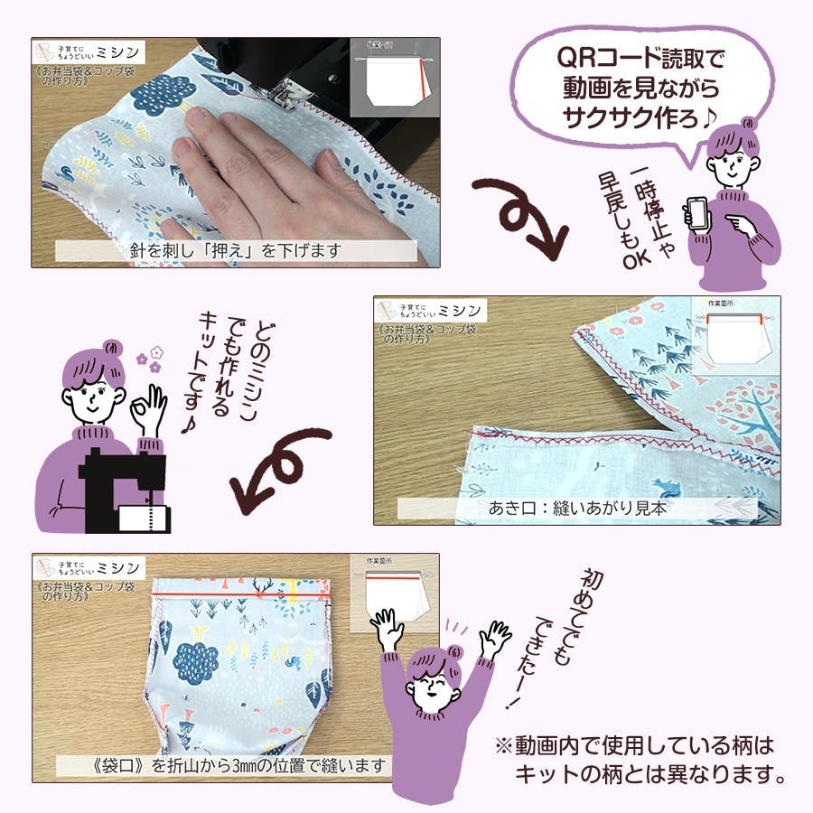 付属のQRコードを読み取って、専用レシピ動画を見ながらサクッと作れちゃう♪入園入学準備にぴったり!そのほかベビーグッズなど、ミシン初心者でもあんしんの簡単な手作りキットです。原寸大型紙つきなので、お好きな生地をカットして使い回すこともできます。