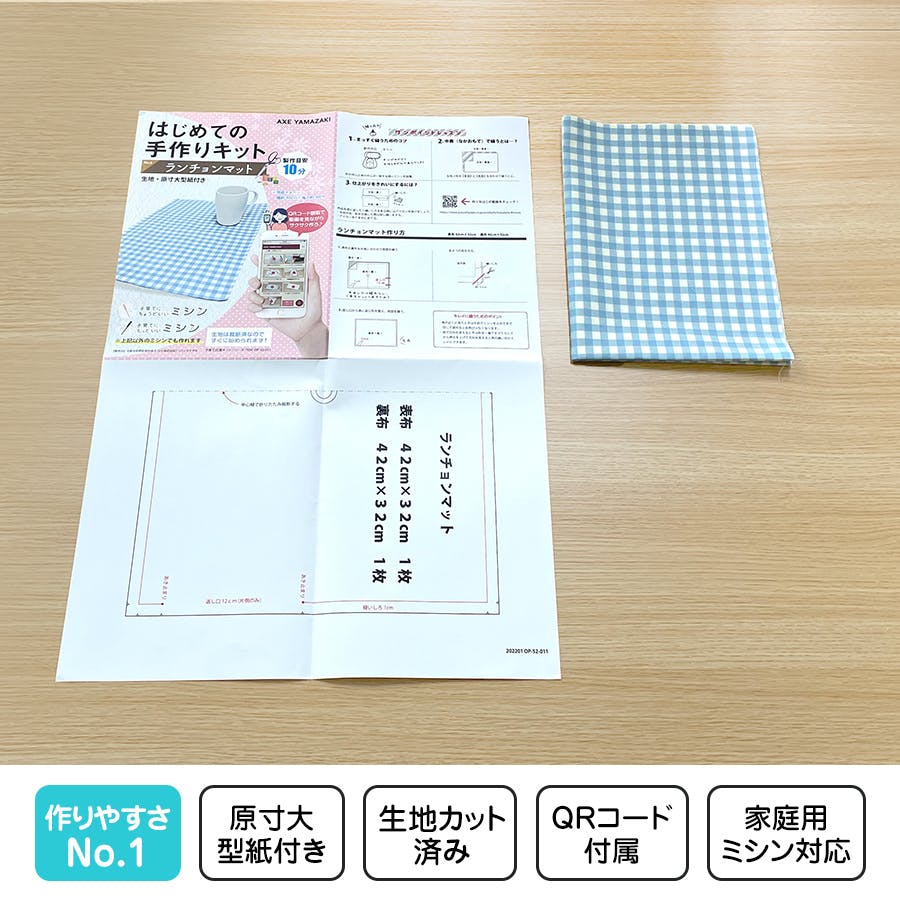 はじめての手作りキット 【 ランチョンマット ギンガムチェック 】 手作りキット ミシン 簡単 初心者 型紙付 生地 日本製 QRコード 動画 レシピ ハンドメイド 手芸 ハンドクラフト 裁縫 子育てにちょうどいいミシン 入園入学 グッズ セット 手作り キット 給食 アックスヤマザキ