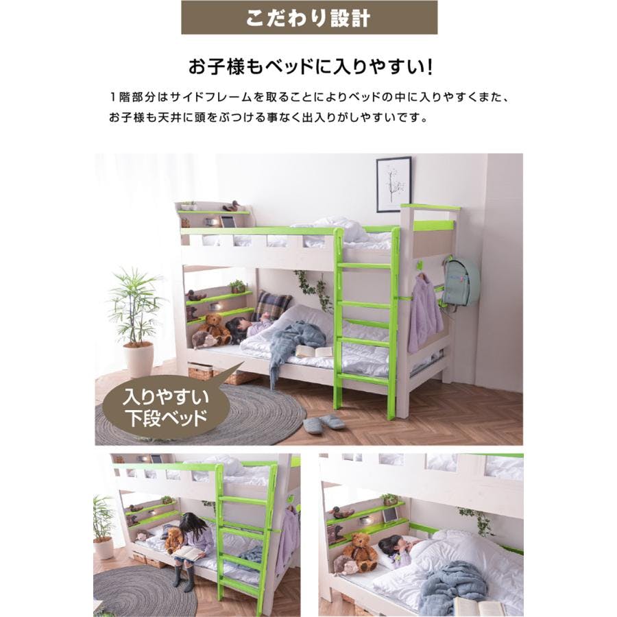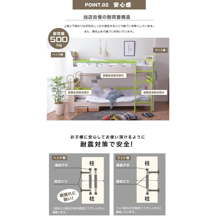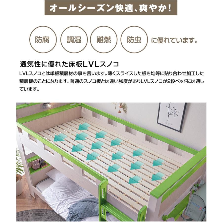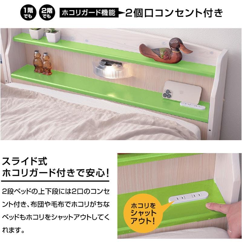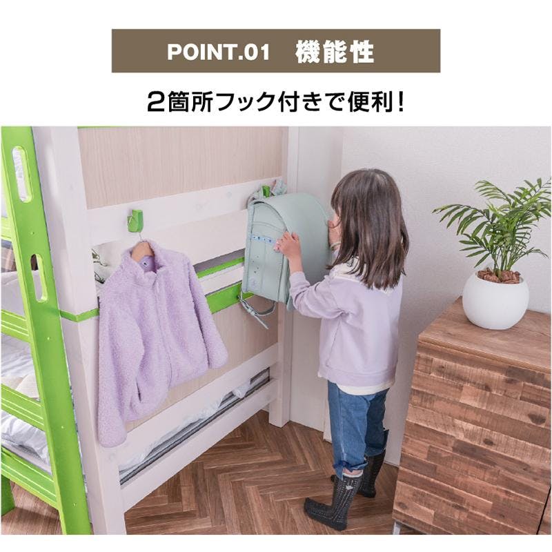 LED照明と埃をガードするスライド式2口コンセントを上下段に搭載し、暗い室内でも快適に使えます。柱の強固なビス連結や極太開き止めにより優れた耐震性を確保。通気性抜群のスノコ床板は取り外し可能で掃除も簡単。手掛け付きハシゴは滑りにくく、安全に昇降可能。丸みを帯びたデザインでお子様にも安心。ロータイプ仕様で圧迫感が少なく、分離してシングルとしても長く使える実用的なベッドです。