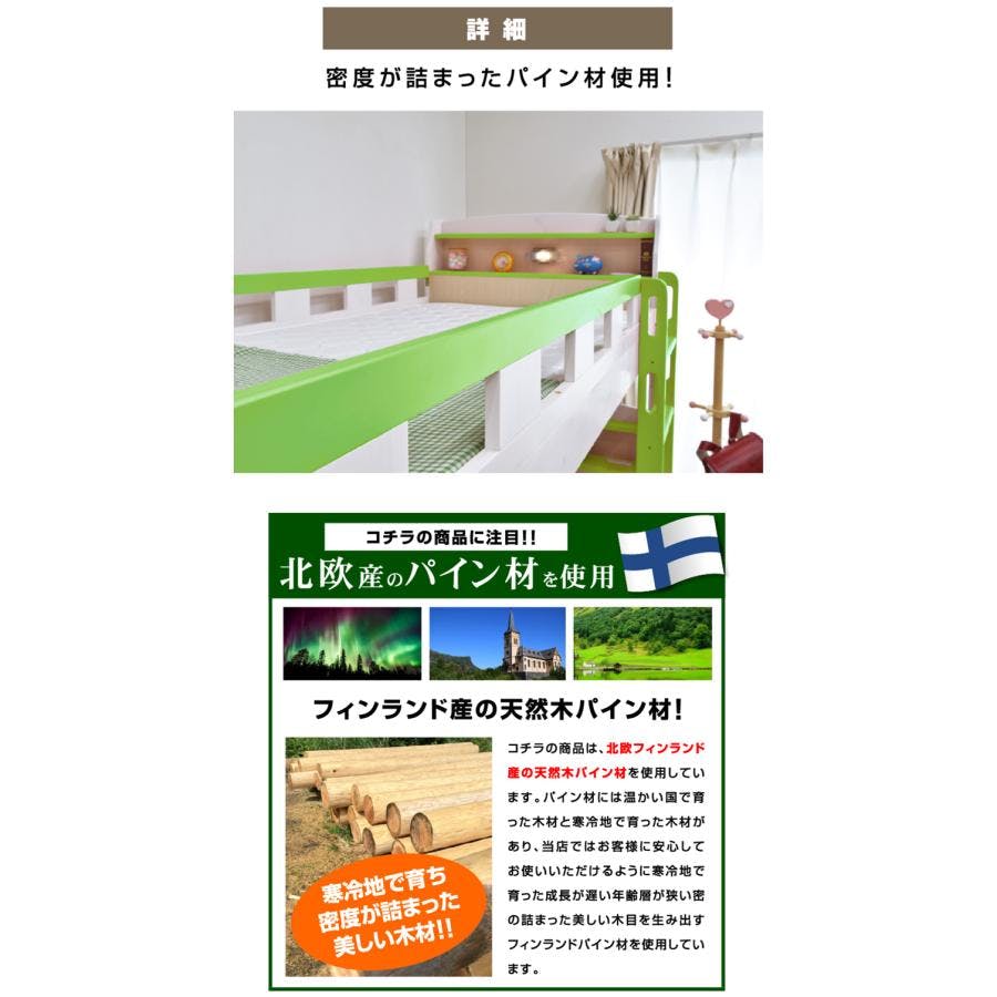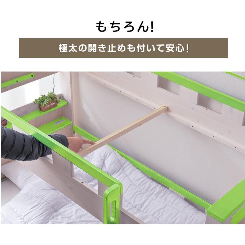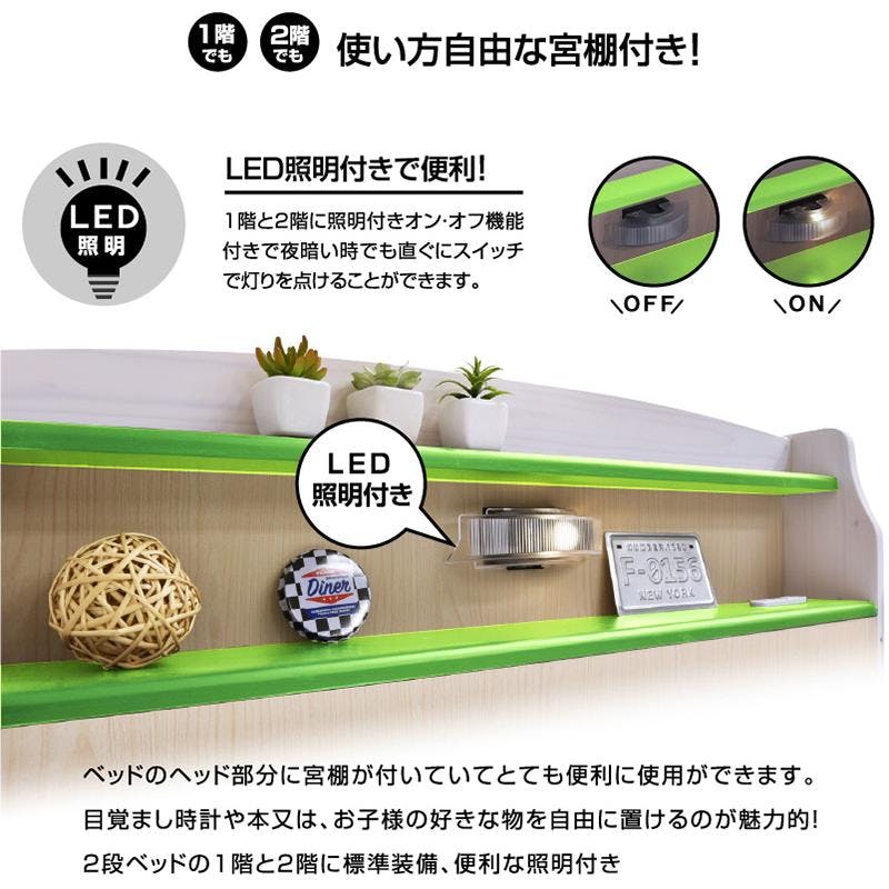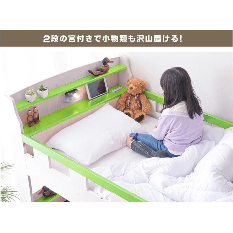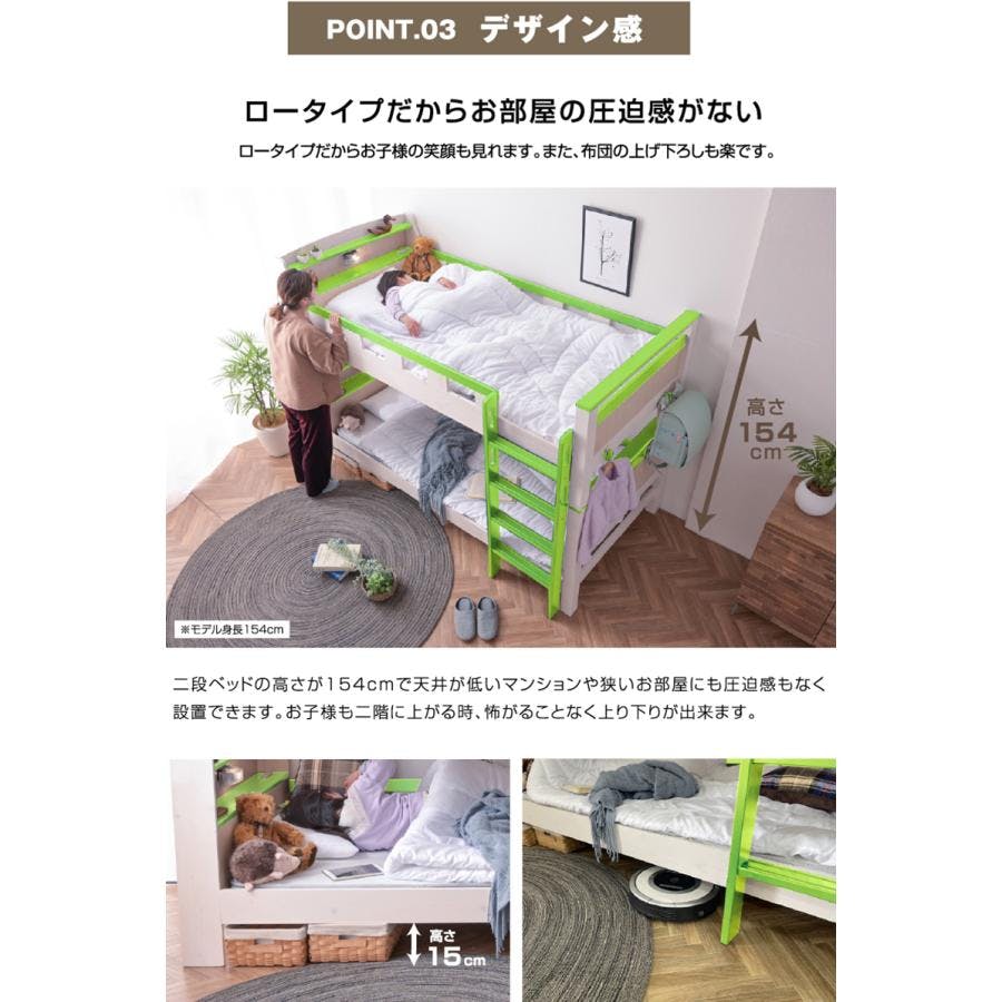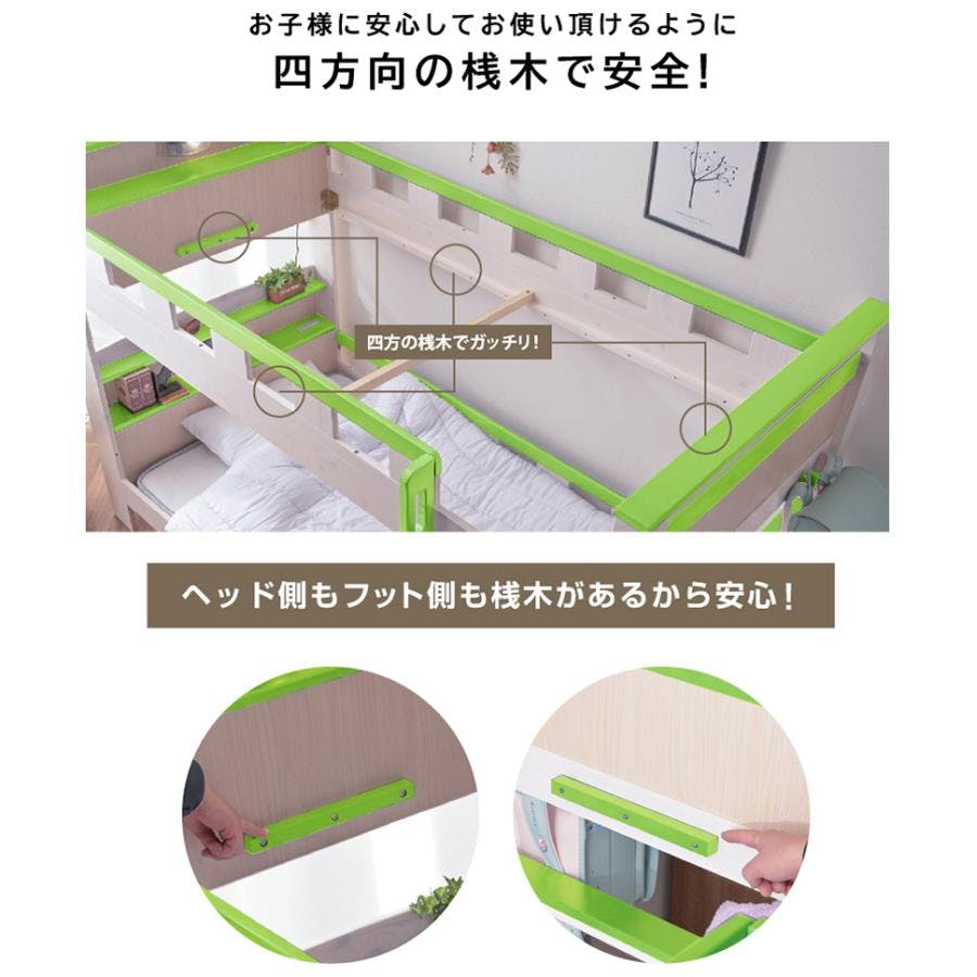 LED照明と埃をガードするスライド式2口コンセントを上下段に搭載し、暗い室内でも快適に使えます。柱の強固なビス連結や極太開き止めにより優れた耐震性を確保。通気性抜群のスノコ床板は取り外し可能で掃除も簡単。手掛け付きハシゴは滑りにくく、安全に昇降可能。丸みを帯びたデザインでお子様にも安心。ロータイプ仕様で圧迫感が少なく、分離してシングルとしても長く使える実用的なベッドです。