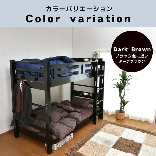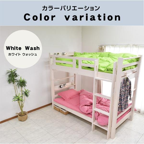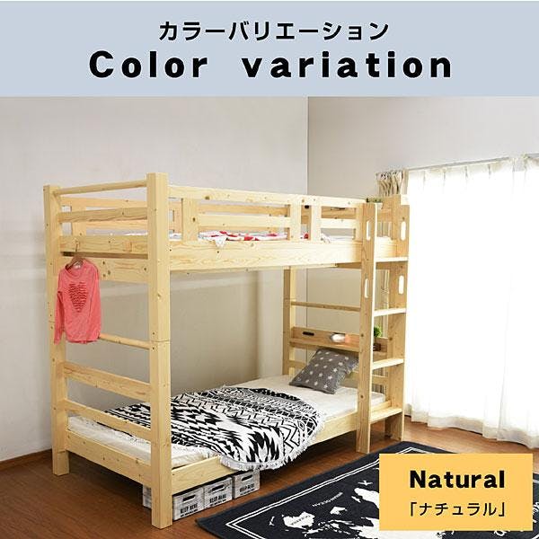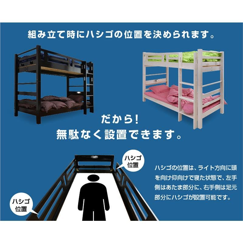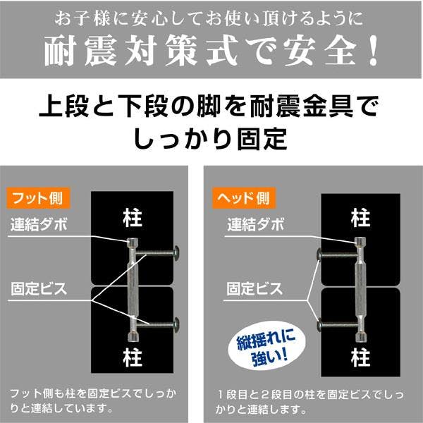 上下段ともにLED照明と埃防止スライド式2口コンセントを装備し、機能性と快適性を両立。上下のベッド間には約1mの空間があり、大人の使用にも適しています。北欧産パイン無垢材を使用し、極太角柱と補強フレームで支える耐震連結構造を採用。垂直ハシゴは省スペースで配置が自由。分割してシングルベッドとしても使用可能で、使い方に幅が広がります。耐荷重は驚異の900kgで、安全性も抜群です。