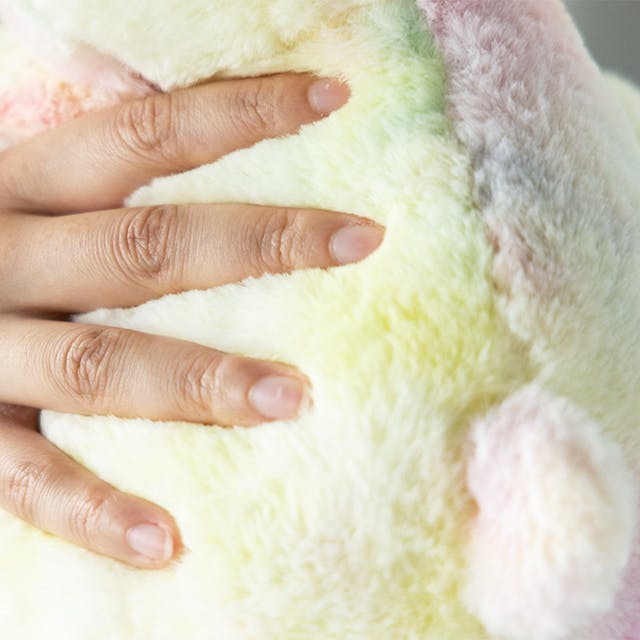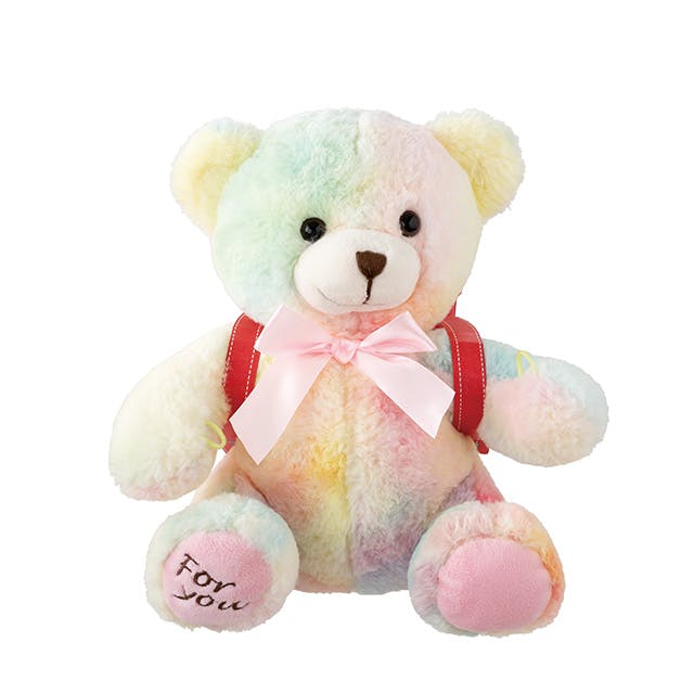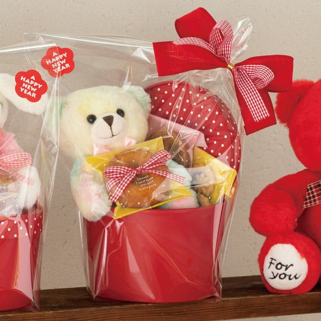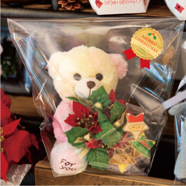 リボンを通してギフトを持たせることができます/商品により柄の出方が多少異なります/足の裏にメッセージが刺繍されています