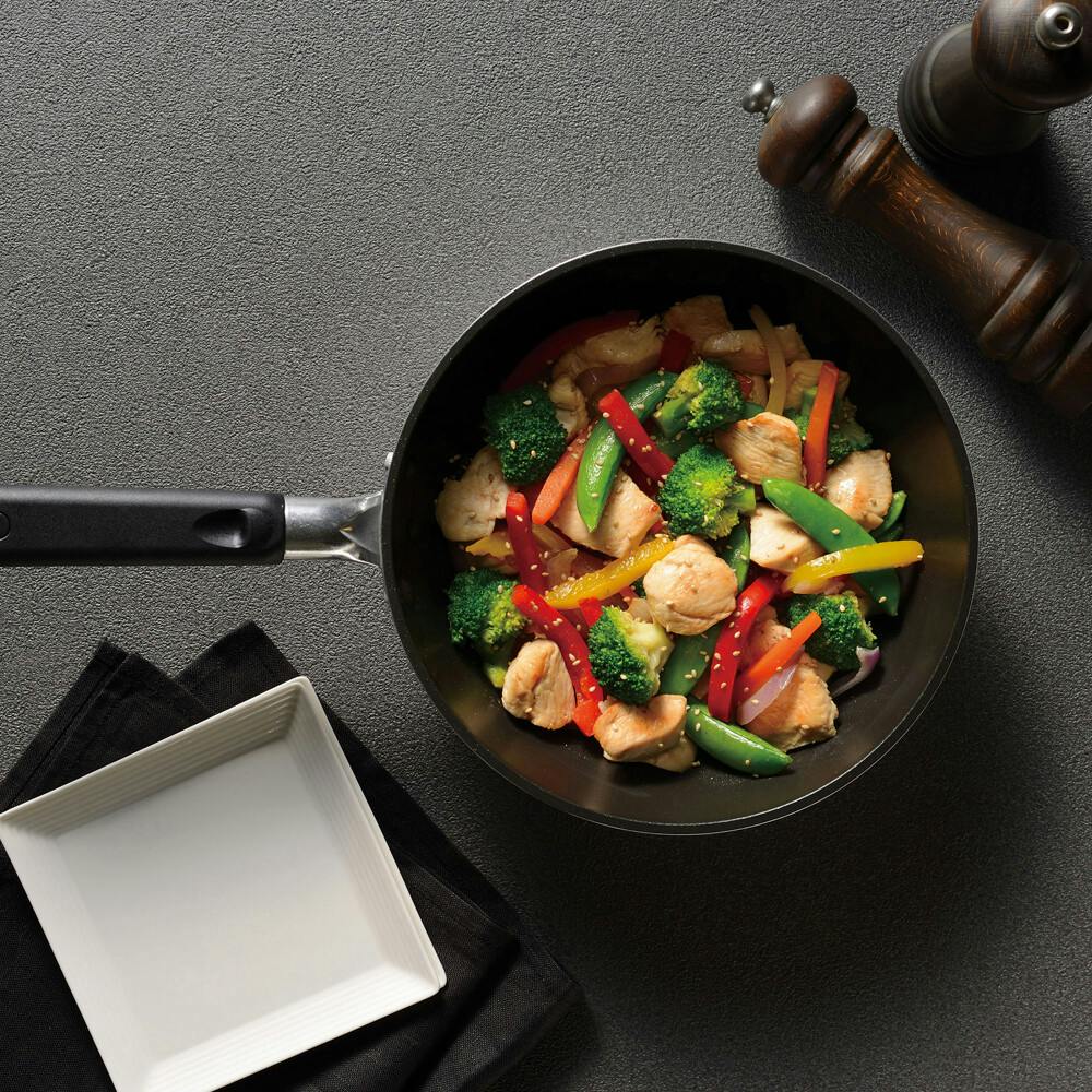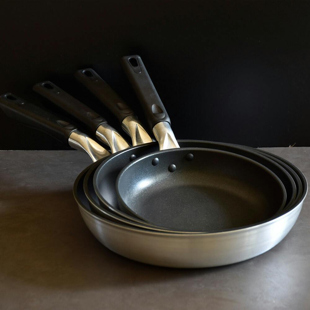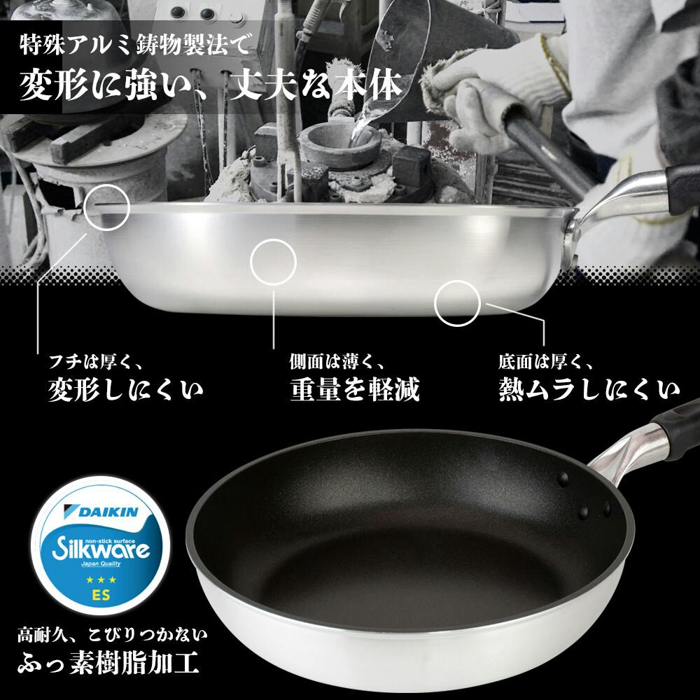 本体:アルミニウム合金、内面:ふっ素樹脂加工(シルクウェアES)、外面:研磨仕上、ハンドル:フェノール樹脂