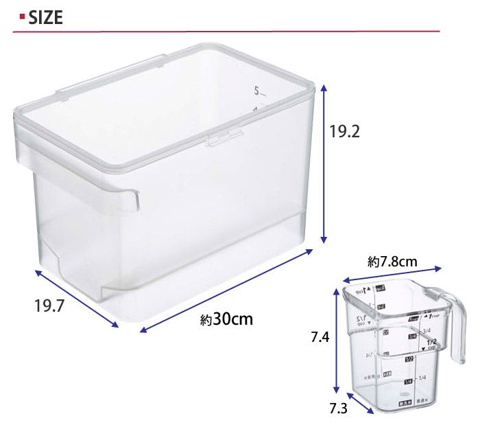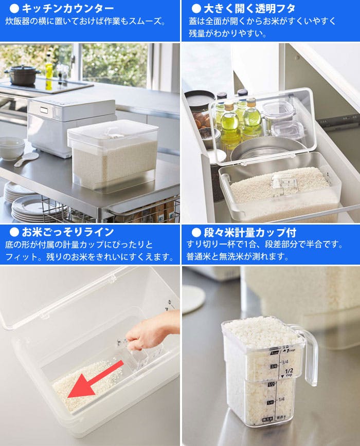 システムキッチンの引き出しに合うスタイリッシュな米びつ。パッキンでしっかり密閉され、お米が最後まできれいにすくえます。 蓋をパチッとロックしておけば、お米を湿気と酸化から防いでくれます。キッチンカウンターなど炊飯器の横に置いてもスタイリッシュで作業もスムーズ。 蓋は全面が開くからお米がすくいやすく、残量が分かりやすい透明蓋。 段差メモリで一目で分かる段々米計量カップが付属しています。すり切り一杯で1合、段差部分で半合です。普通米と無洗米が測れます。 底面のお米ごっそりラインで、底の形が付属の計