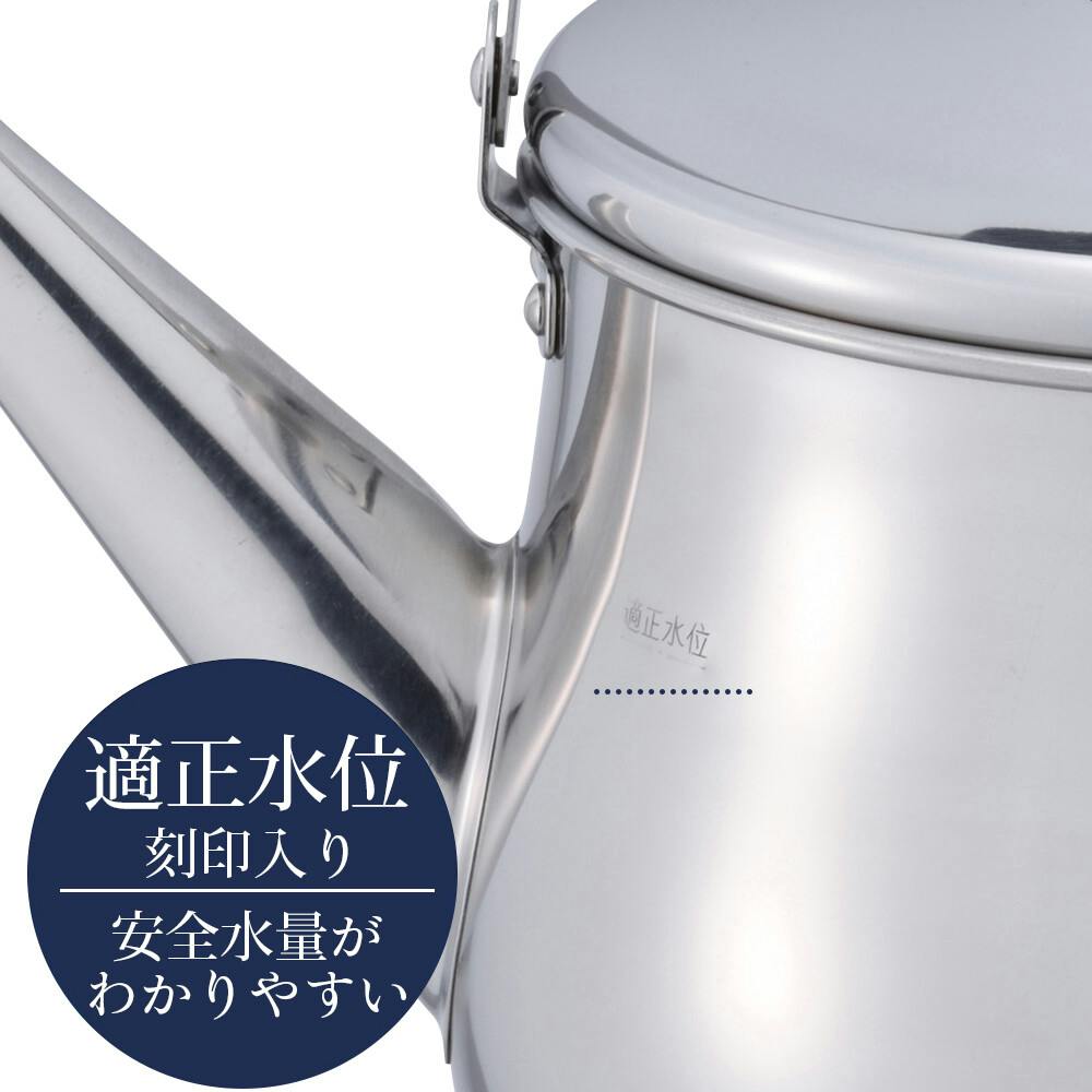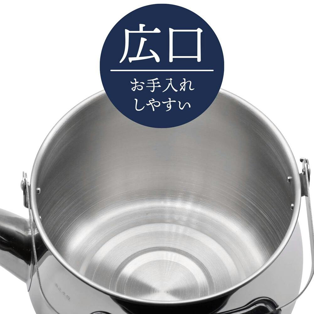すっぽり手が入る位の広口なので、洗いやすく、気になる水アカも使用毎のお手入れで防げます。ガスコンロでもIHクッキングヒーターでも使えます。側面に適正水位の刻印入り。安全に沸かせる水量が確認できます。