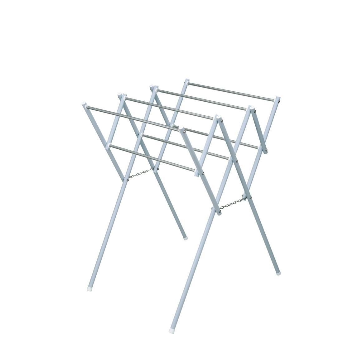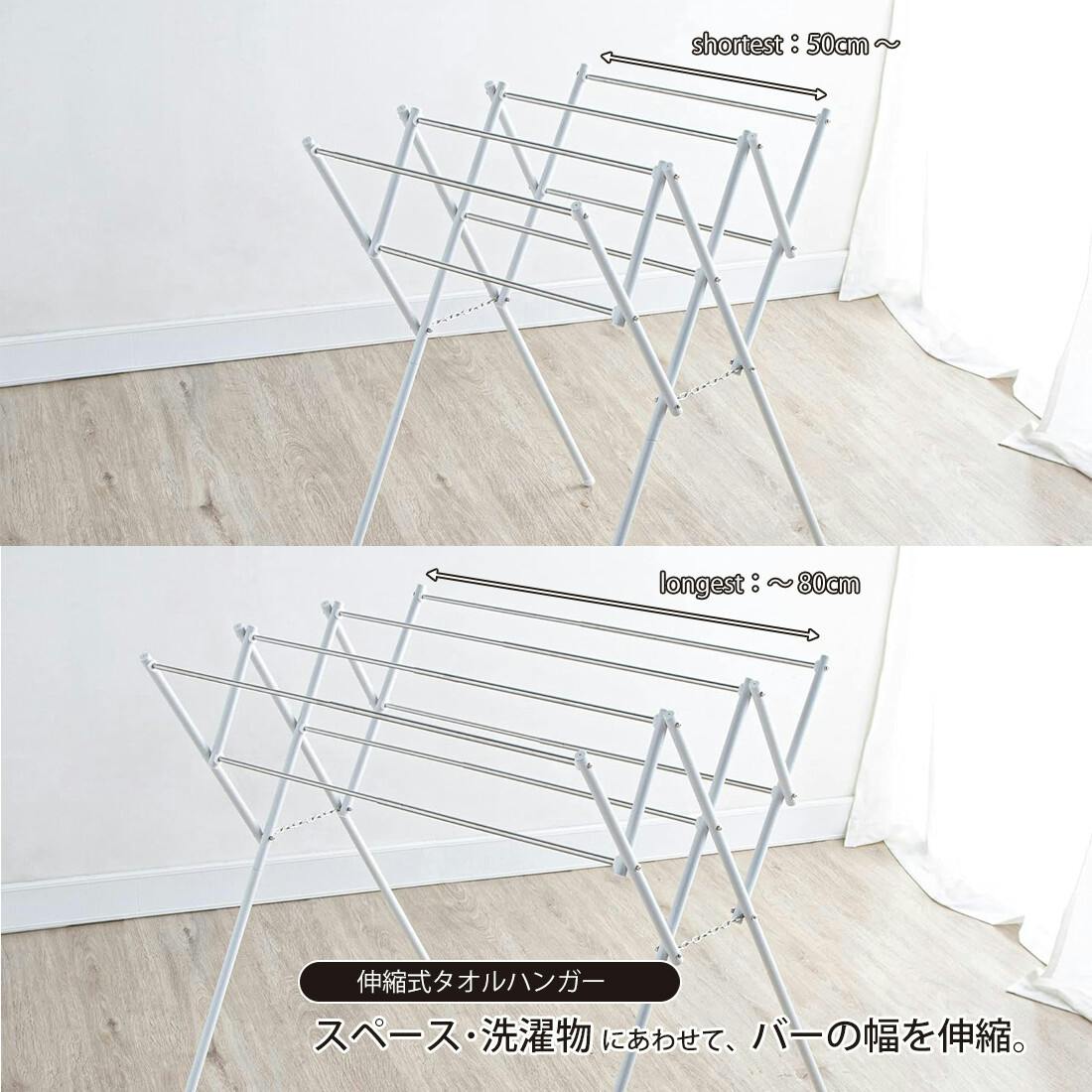 伸縮式タオルハンガー(MJ-0704) / 商品サイズ(約):使用時/500~800×640×750mm・収納時/500×80×845mm / 商品重量(約):1400g / 耐荷重:全体約9.1kg/ハンガー部約1.3kg(1本あたり)