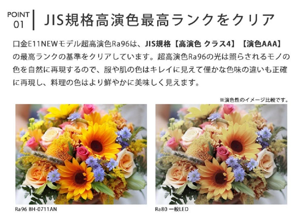 • 高演色クラス4 演色AAA LED電球 E11 60形相当 高演色Ra96 フリッカーフリー 電球色2700K BH-0711AC-BK-27-Ra96