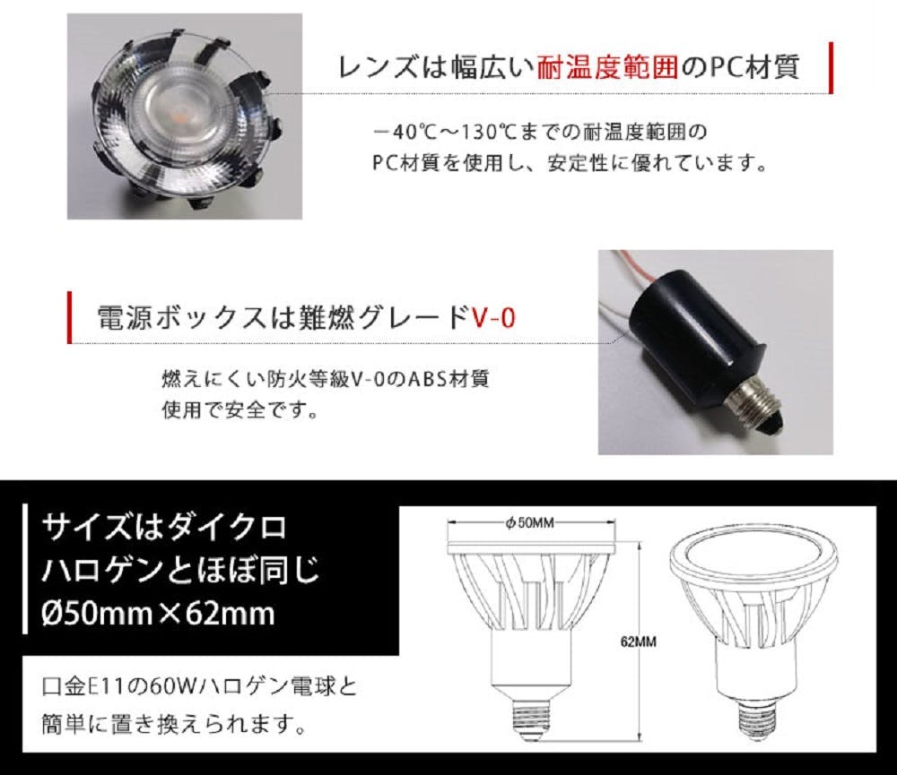 ■口金サイズ:E11■調光器対応0%-100%(お使いの調光器によって調光可能範囲は異なります)■防塵防水不可■屋外使用不可■設計寿命30000h(光束維持率70%) ※設計寿命であり保証するものではありません。■使用温度範囲-10℃ 〜 40℃■PL保険加入済み■2年保証
