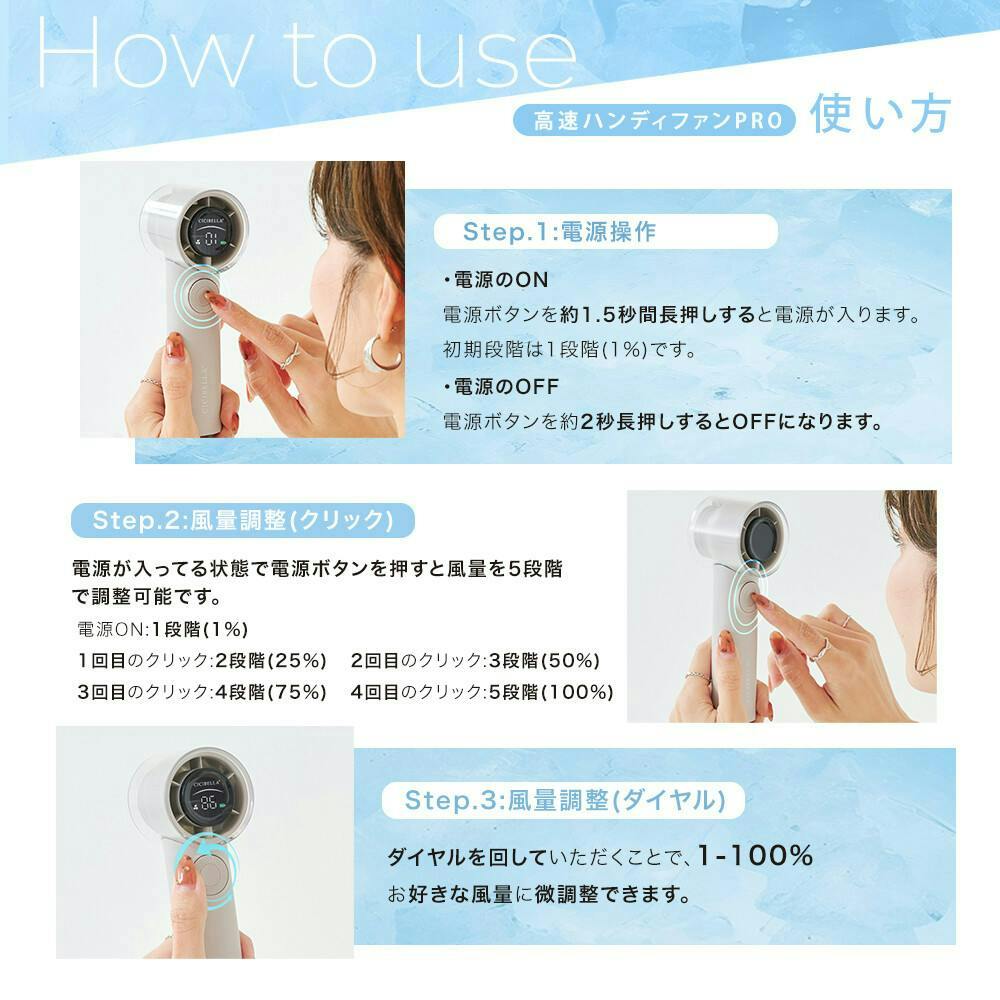 ●製品仕様/製品名: 高速ハンディファンPRO/サイズ:約167×56×53mm/重量:約178g/電池容量: 2000mAh/定格入力:5V/2A/充電方法:USB Type-C/充電時間: 約2.5時間/持続時間:ファンのみ使用/1段階:約9時間/25段階:約5時間/50段階:約3.8時間/75段階:約2.5時間/100段階:約2時間/風量調節:100段階/付属品:製品本体/充電ケーブル/取扱説明書