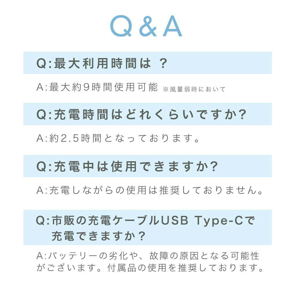 【必ずお読みください】 ※使用中の故障トラブルなどについては当社は一切の責任を負いかねます。 ※使用時間は目安です。使用環境や使用頻度により変化する場合があります。 ※充電中は使用しないでください。 ※磁石に近づけないようにしてください。 ※充電をする際には、付属のケーブルをご利用ください。 ※充電をする際にはコンセント側にUSB-A、本体側にTYPE-Cを接続してください。 ※乳幼児などお子様の手の届くところには置かないでください。