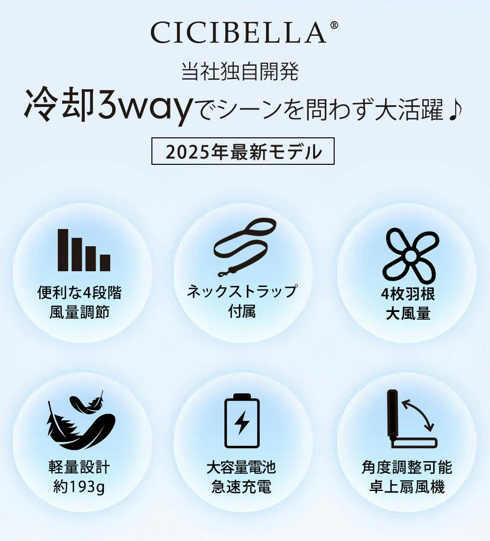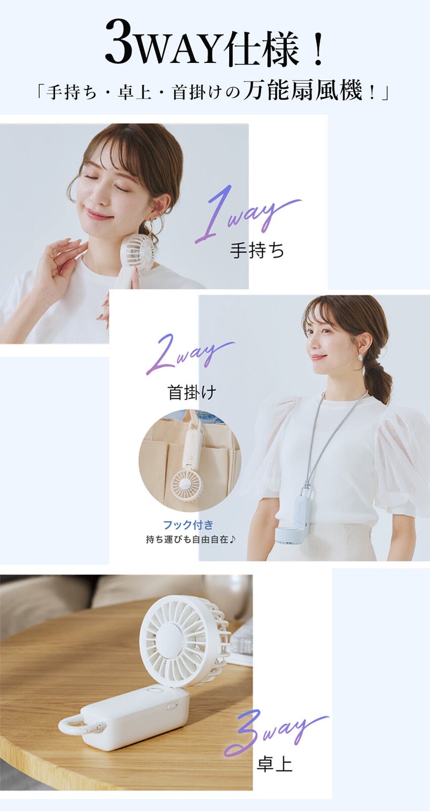 1台3役!首かけ・手持ち・卓上!超軽量&静音設計 で、どこでも快適に涼める万能冷却ハンディファン!持ち運びラクラクな193gの軽量設計風量は4段階調整可能で、シーンに合わせてお好みの風を♪さらに、静音設計&USB充電対応 だからオフィスや寝室でも快適に使えます!