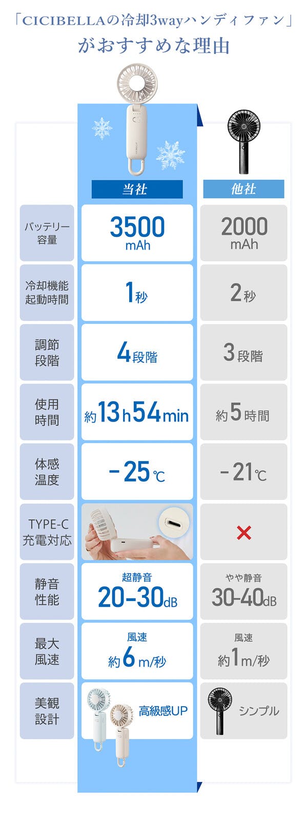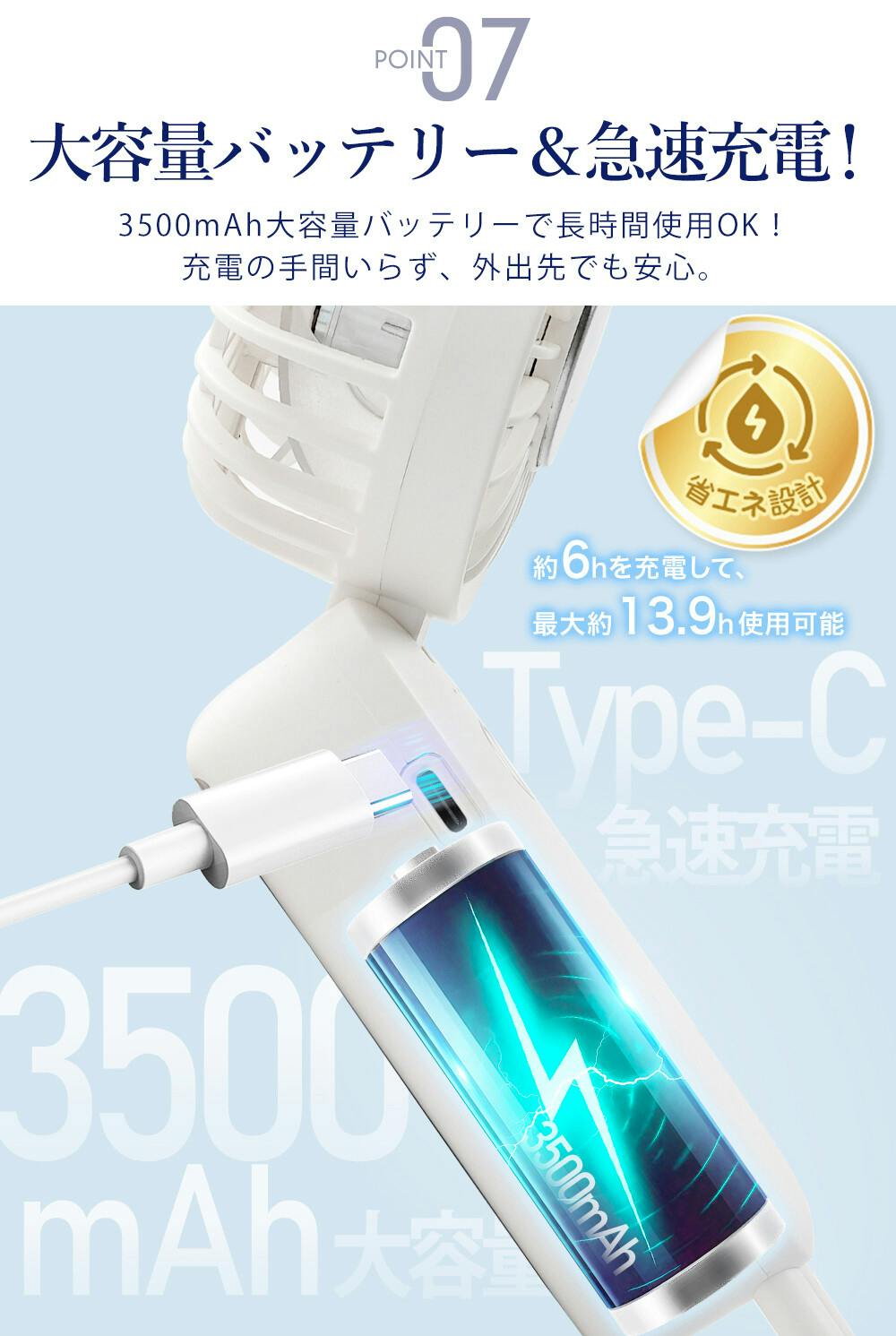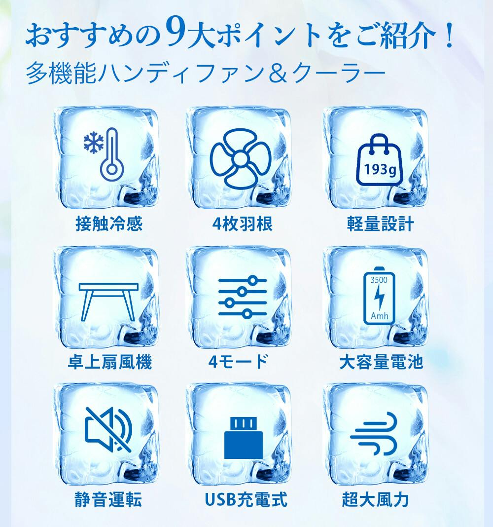 ●製品名:冷却3wayハンディファン/サイズ:約204mmx75mmx44mm/重量:約193g/風量:4段階/電池容量:3500mAh/定格入力:5V/1A/充電方法:USB Type-C/充電時間: 約6時間/使用時間:ファンのみ使用/1段階:13.9h/2段階:8h/3段階:5.4h/4段階:3.5h/ファン+冷却使用/1段階:約2.4時間/2段階:約2.1時間/3段階:約2時間/4段階:約1.5時間 内容物:本体、取扱説明書、充電ケーブル、ストラップ