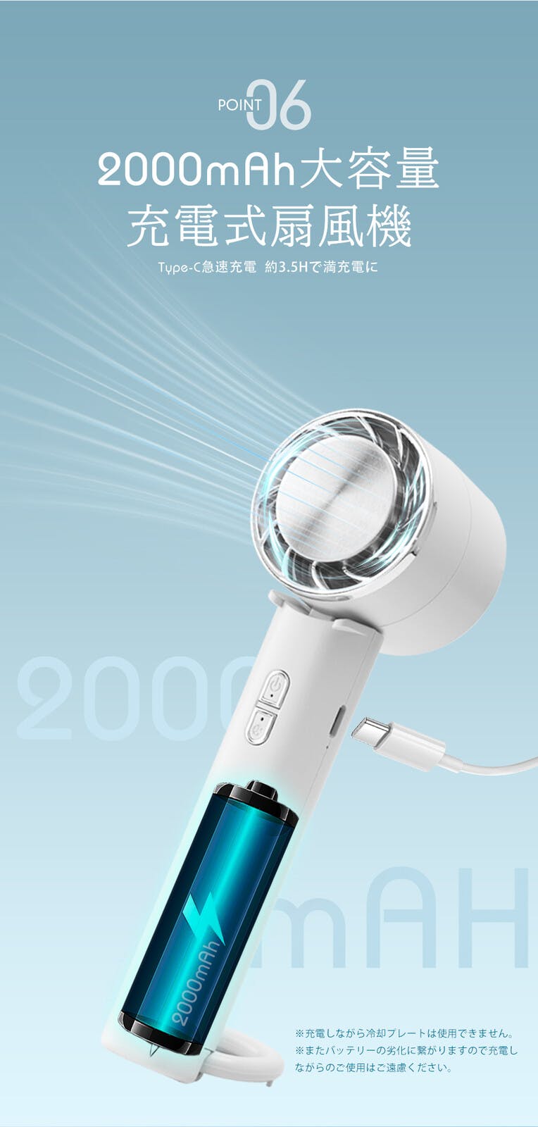 ●サイズ:約205*52*50MM/重量:146g/風量:弱/中/強/ 3段階/電池容量: 2000mAh/使用時間: 約7.5時間/充電時間: 約3.5時間/入力電圧:5.0V/入力電流:1.0A
