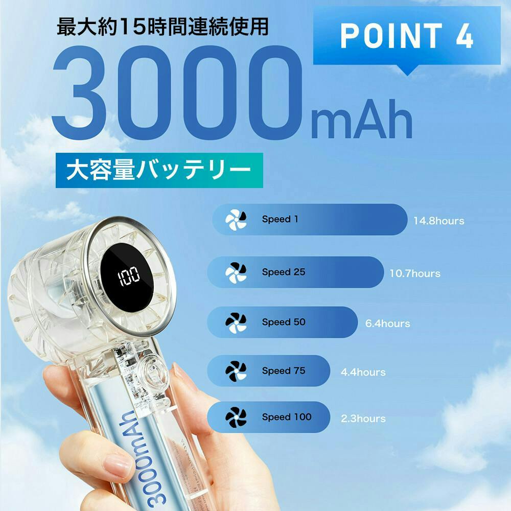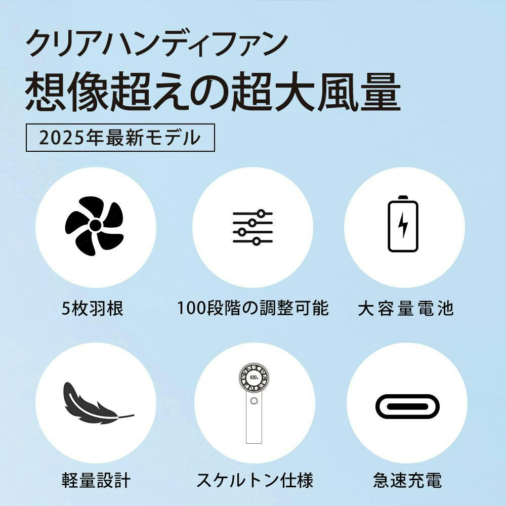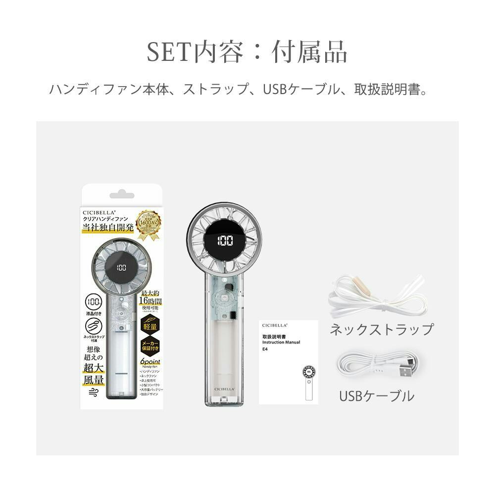 ●製品名:シシベラ クリアハンディファン/サイズ:約140mmx52mmx50mm/重量:約163g/電池容量: 3000mAh/定格入力:5V/1A (TYPE-C)/充電方法:USB Type-C/充電時間: 約5.2時間/持続時間:/1段階約14.8時間、/25段階約10.7時間、/50段階約6.4時間、/75段階約4.4時間、/100段階約2.3時間/付属品:製品本体/充電ケーブル/取扱説明書/ネックストラップ
