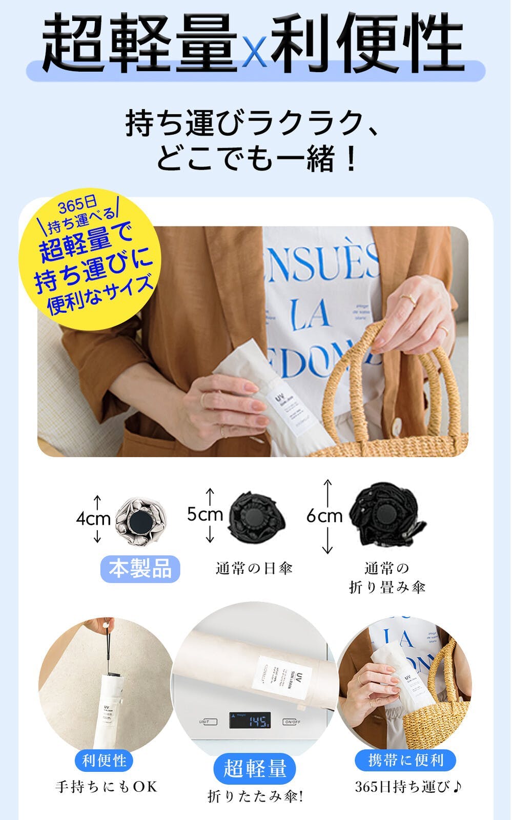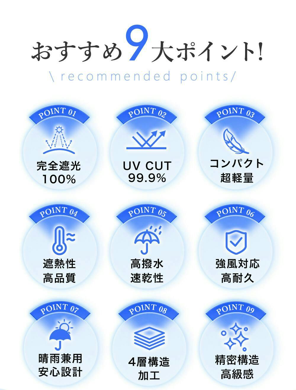 ●全長:507cm/収納時の長さ:22cm/直径: 90cm/重さ:約145g/※測定方法によって誤差が生じますので、予めご了承下さい。 特徴/遮光率/100% 一級遮光/UV遮蔽率/90%以上/近赤外線遮蔽率/99.9%/晴雨兼用/撥水等級5級/カーボン耐風骨