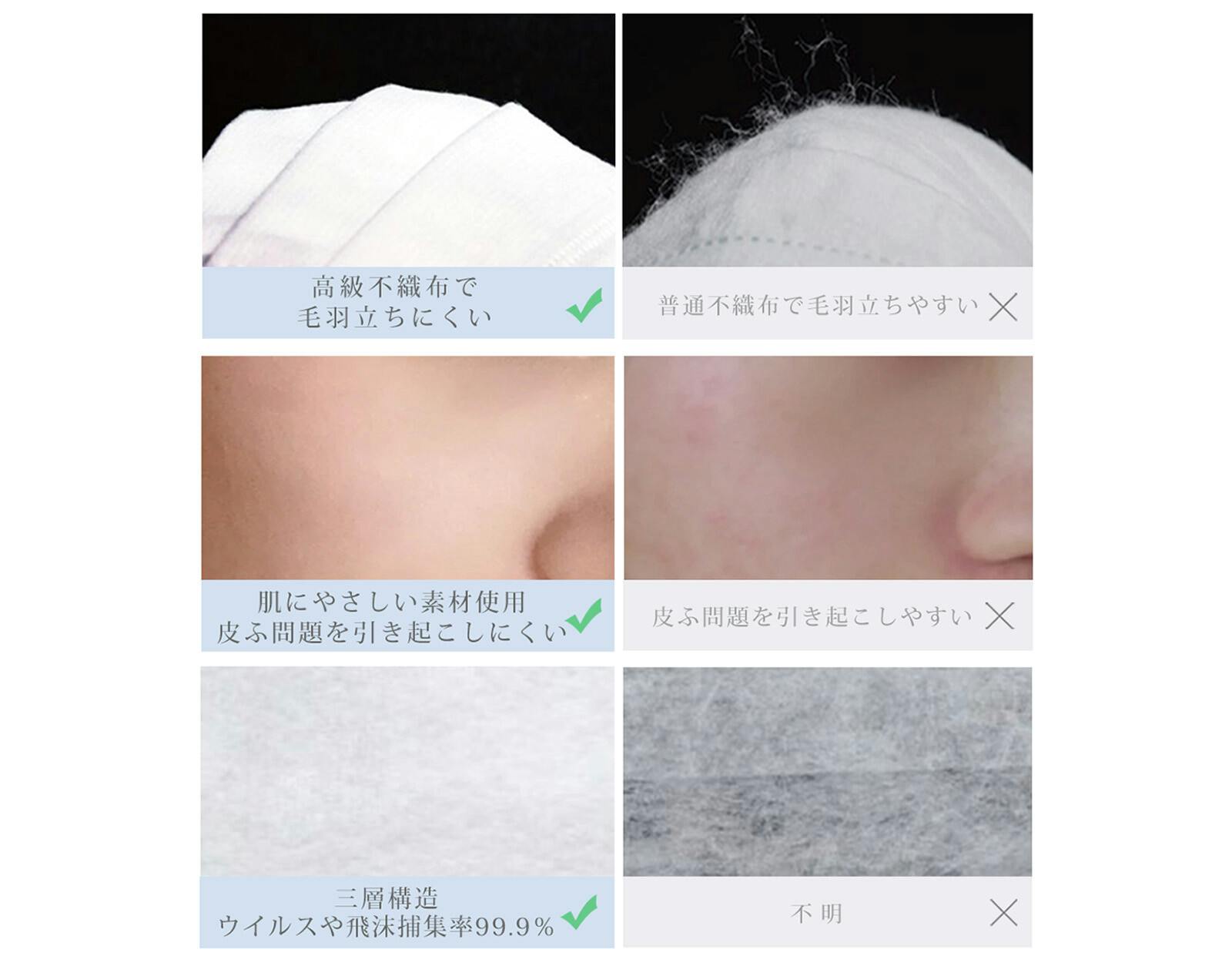 【使用上の注意】 ●本品は有害な粉塵、ガス等を防ぐ目的には使用できません。 ●皮膚に異常がある場合や異常があらわれた場合には使用を中止してください。 ●着用中、においで気分が悪くなった場合には使用を中止してください。 ●本品は三層不織布で作られた使い切りタイプなので洗って再使用しないでください。 ●汚れたら新しいものと交換してください。 ●乳児の手の届くところに置かないでください。 ●対象用途以外に使用しないでください。