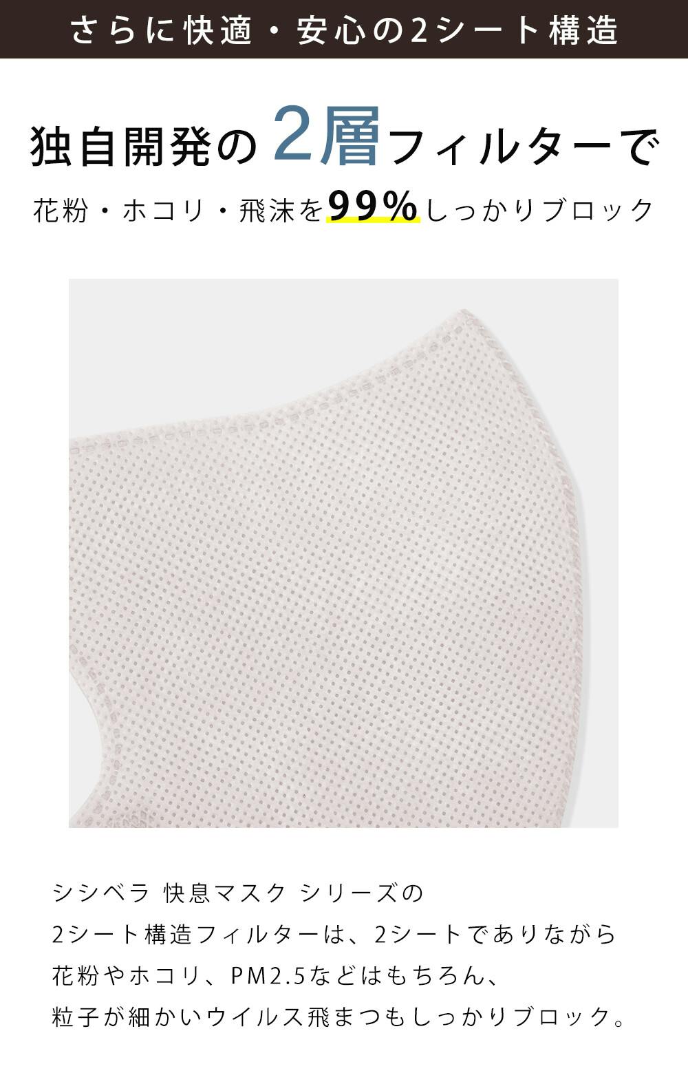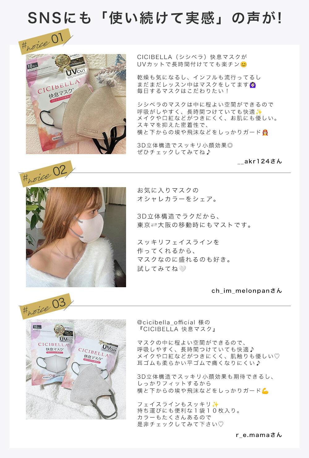 独自の生地により息のしやすいマスクに!/独自開発2層フィルターでさらに安心・快適に CICIBELLA 6D MASKは高密度フィルターを採用し、ウイルスや飛沫などを99%カットする高機能マスクです。/機能だけでなく、独自の6D構造で美しいフェイスラインを実現。/全てに妥協することなく、こだわり抜いたCICIBELLA自慢のマスクです。