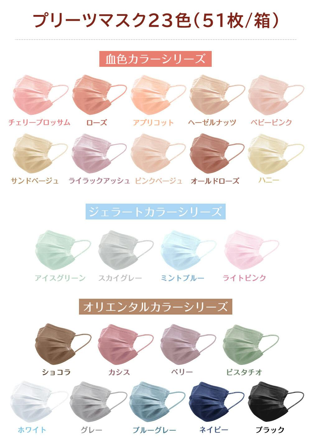 王道プリーツマスクをオシャレに。カラーバリエーション豊富で、その日の気分や洋服に合わせてお楽しみいただけます!大容量の51枚入り!