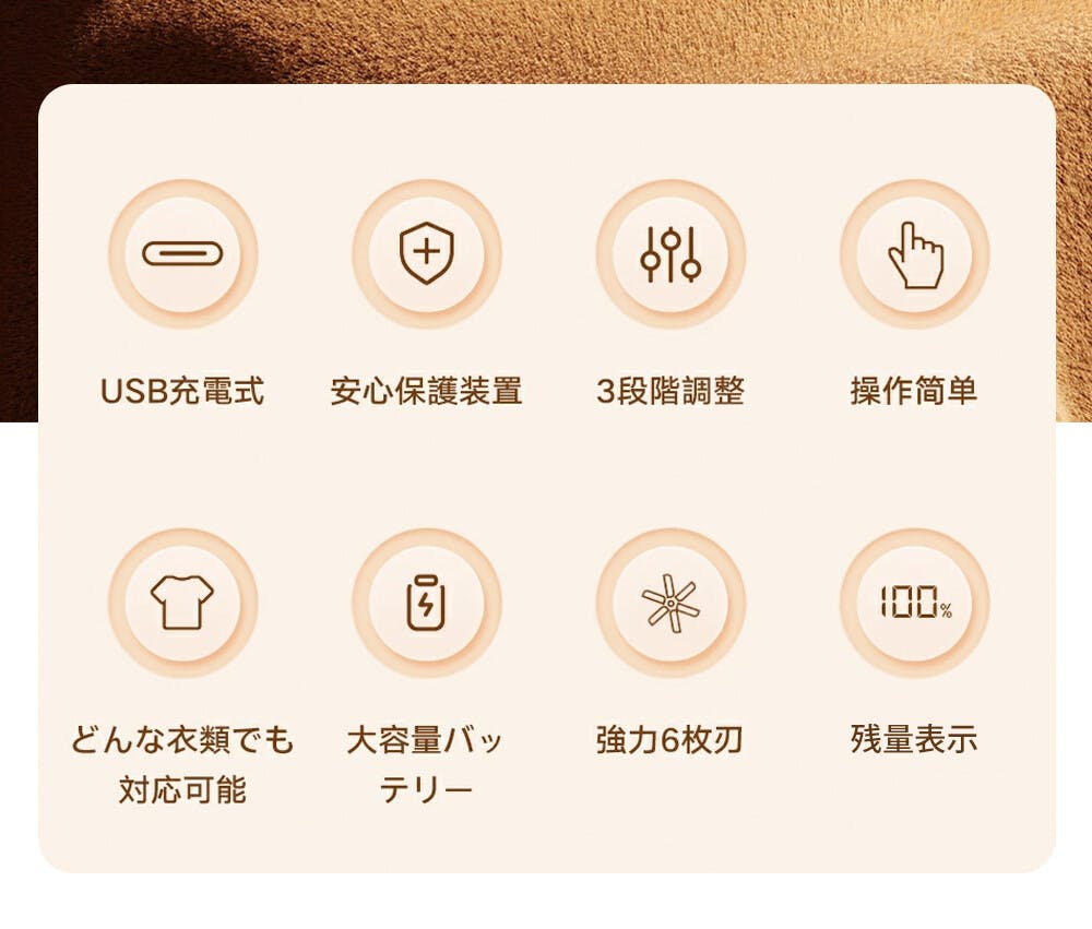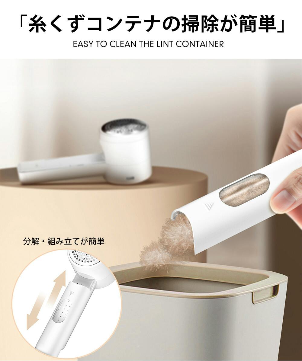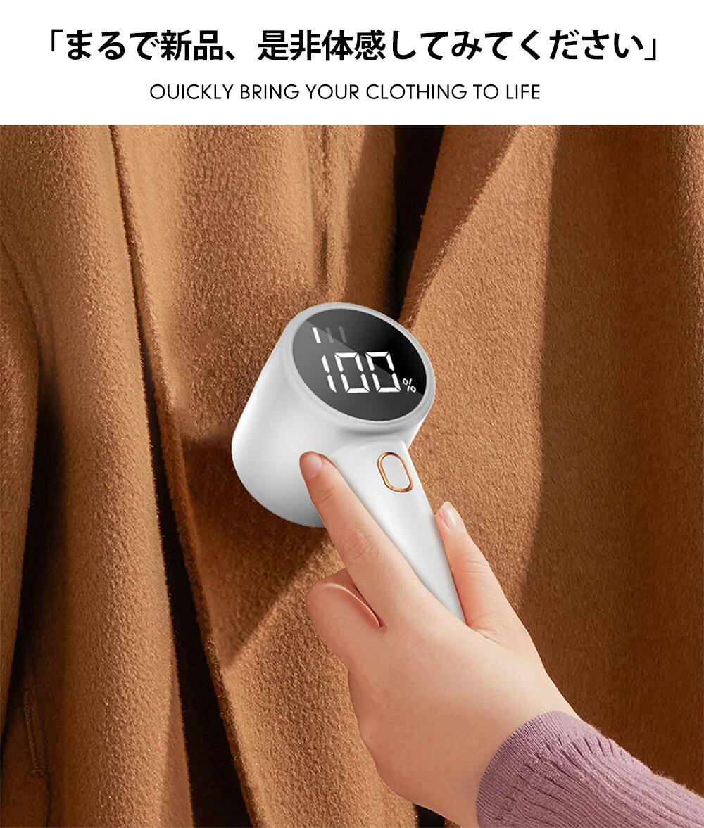 ・短い糸くずや細いシルク、繊細な織物は、過度の力を加えると破損しやすいため、注意して操作してください。・ステンレス網がいっぱいになった場合は、掃除をしてから使用してください。・衣類や毛玉以外のものに使用しないでください。・子供やペットの手が届かない場所に保管してください。・付属の充電ケーブルのみを使用してください。・バッテリーを火中に投じたり、分解、穴開け、落下、衝撃、圧縮、短絡などを行わないでください。・水に濡れたバッテリーを使用しないでください。