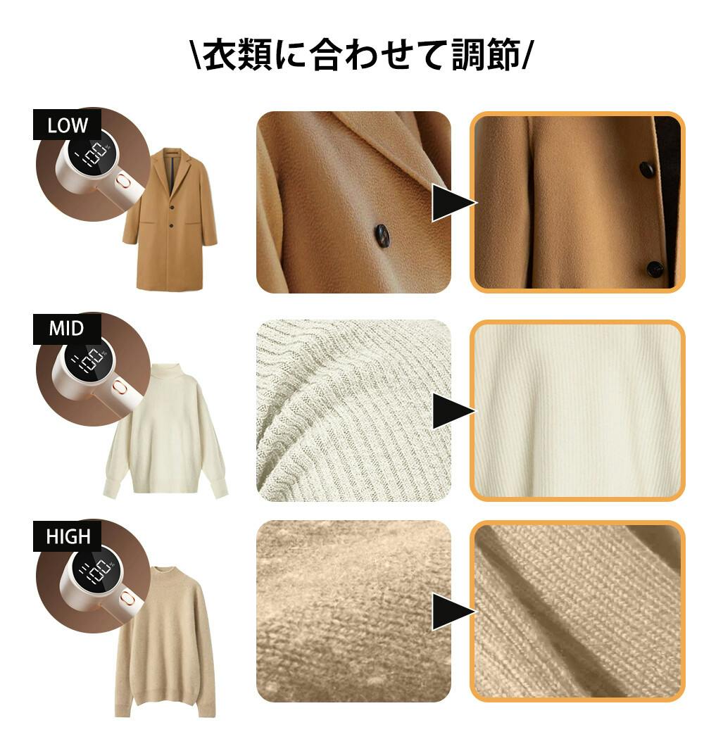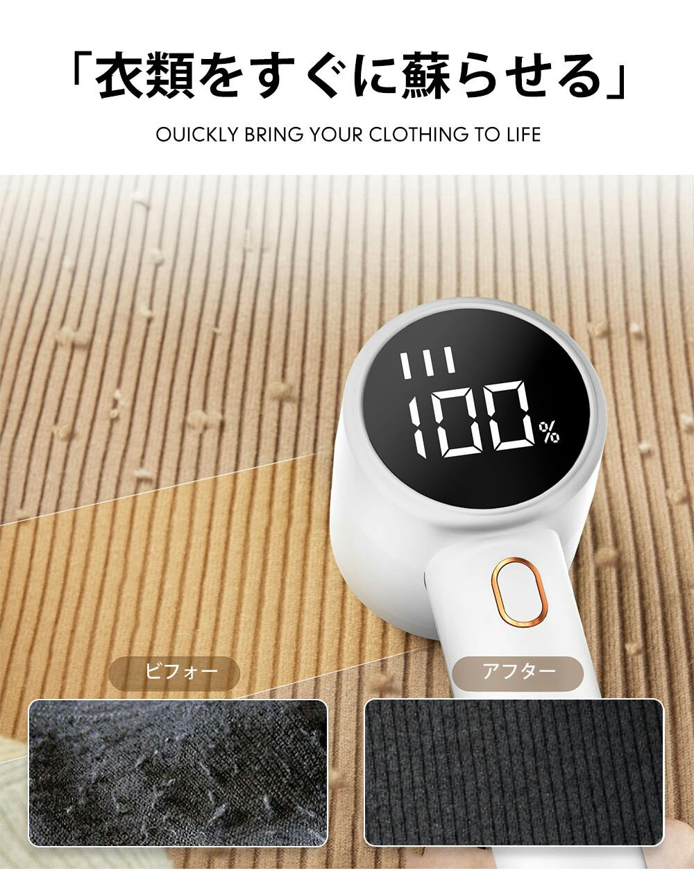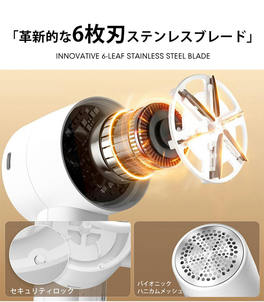 ・短い糸くずや細いシルク、繊細な織物は、過度の力を加えると破損しやすいため、注意して操作してください。・ステンレス網がいっぱいになった場合は、掃除をしてから使用してください。・衣類や毛玉以外のものに使用しないでください。・子供やペットの手が届かない場所に保管してください。・付属の充電ケーブルのみを使用してください。・バッテリーを火中に投じたり、分解、穴開け、落下、衝撃、圧縮、短絡などを行わないでください。・水に濡れたバッテリーを使用しないでください。