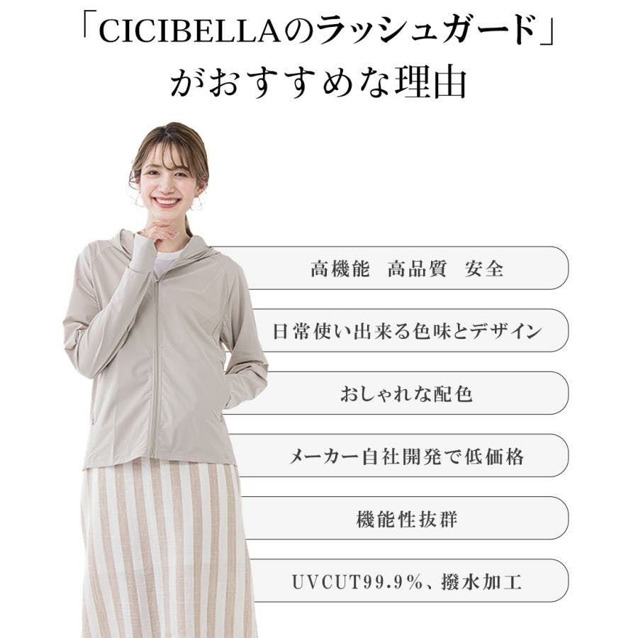 ●商品名 CICIBELLA ラッシュガード/ラッシュガード/(特徴) ちょっとした羽織りとしても、 スポーツ、アウトドア時のアウターとしても 活躍する軽量で便利な高機能ウエアです。 【POINT】/・360度紫外線CUT/・雨や水の侵入を防ぎやすい構造/・汗などで発生した蒸気を内側に溜めず、外へ逃がす/・ストレッチ素材により、最適なフィット感を実現/・着心地が良い/・軽量で旅行や出先に持ち運び便利/・アウターとしても、紫外線対策の羽織りとしても