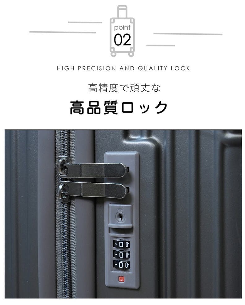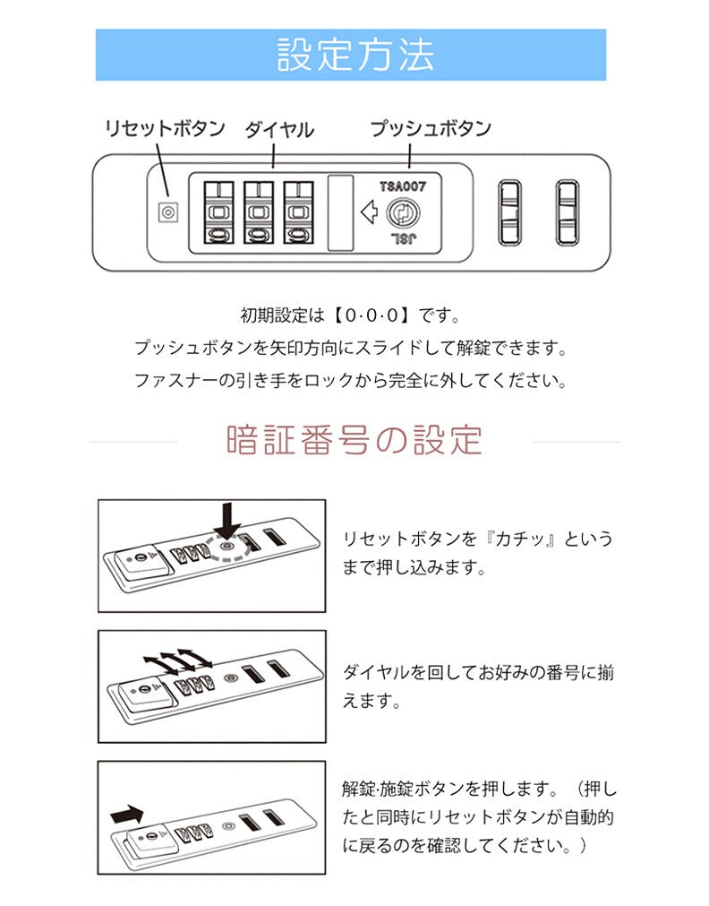 【TSAロックの重要性】TSAロックは先進のロックシステムです。アメリカなどの空港では厳重なセキュリティチェックを目的とし、乗客が預けた荷物の中身を目視で検査します。その際施錠されているケースのロックを壊す権利を持っております。しかしTSAロックであれば、空港側のマスターキーで解錠することができるため、破損なく安心して預ける事ができます。さらに鍵の紛失の心配がない暗証番号式なので使用する際にも便利です。【パスワード変更方法】※初期設定は【0・0・0】です。