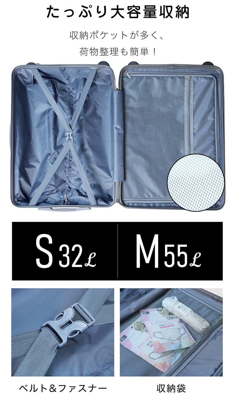 ●製品名:シシベラ スーツケース/● サイズ:/Sサイズ 約535*375*235mm/Mサイズ 約665*445*275mm/● 重量:/Sサイズ 約2.53kg/Mサイズ 約3.05kg/● 容量:/Sサイズ 約32L/Mサイズ 約55L/● 目安:/Sサイズ 1-3泊/Mサイズ 4-7泊