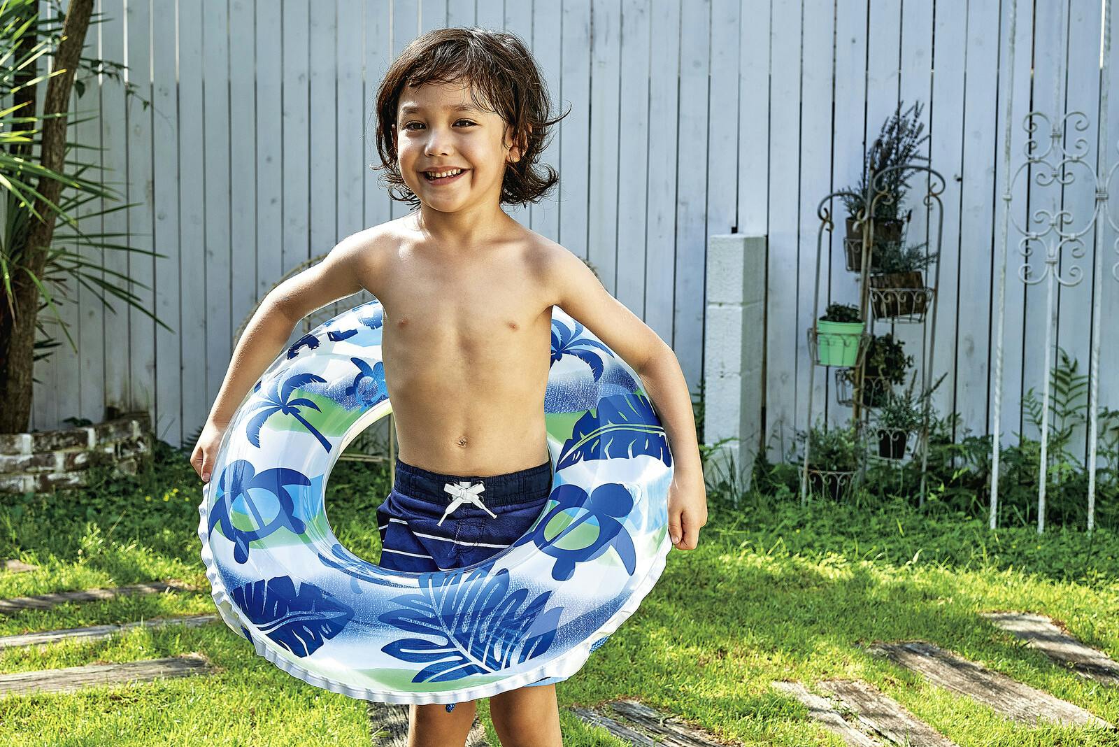 対象年齢4歳~8歳くらいのお子様に最適!。膨らんだ状態のウキワの内周は約85~90cmです。ロープ付き。空気の注入と排出が簡単!「かんたん空気栓」採用。