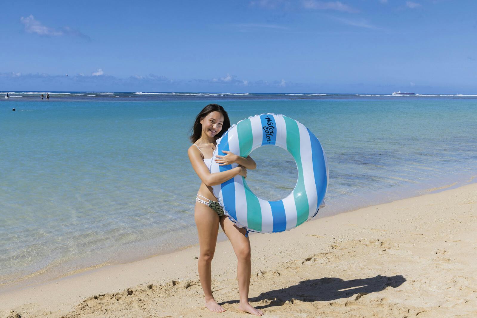 膨らんだ状態の浮輪の内周が約130~135センチとかなり大きめな浮輪です。大人1人がゆったりと入れる大きさです。かんたん空気栓装着商品。ロープ付