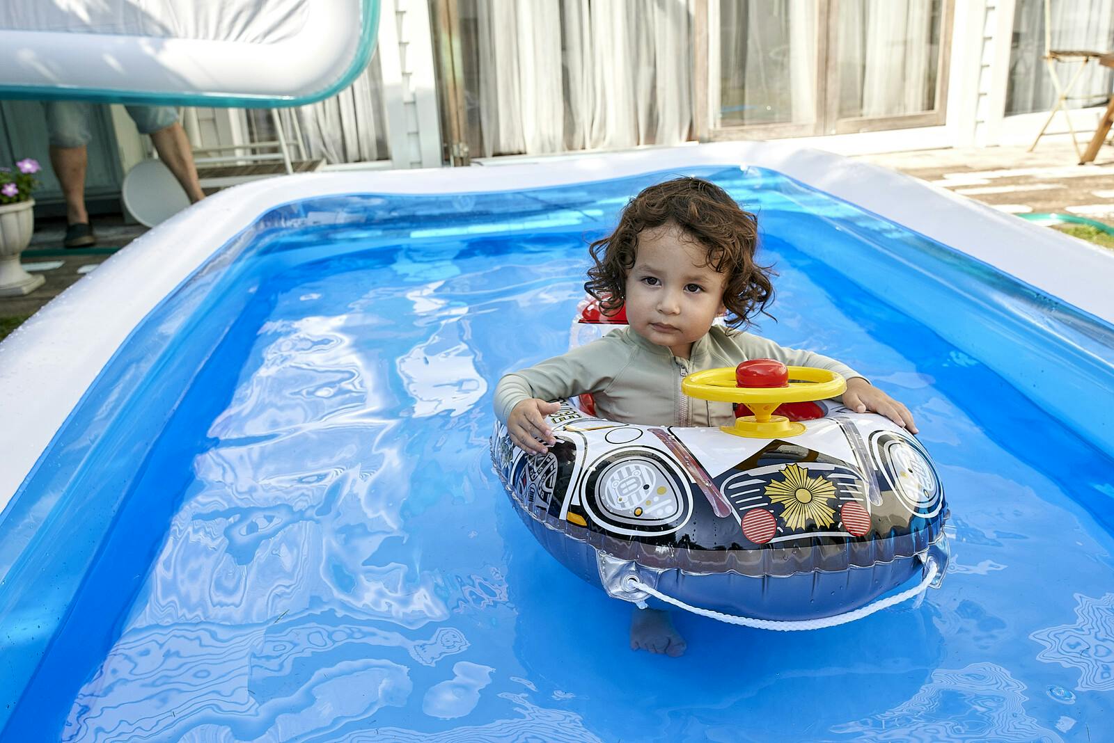 対象年齢1.5~3歳未満。乳幼児のお子様が水に落ち込まないよう浮輪の内側に座が付いたタイプの浮具です。ハンドル付きのボートタイプ。