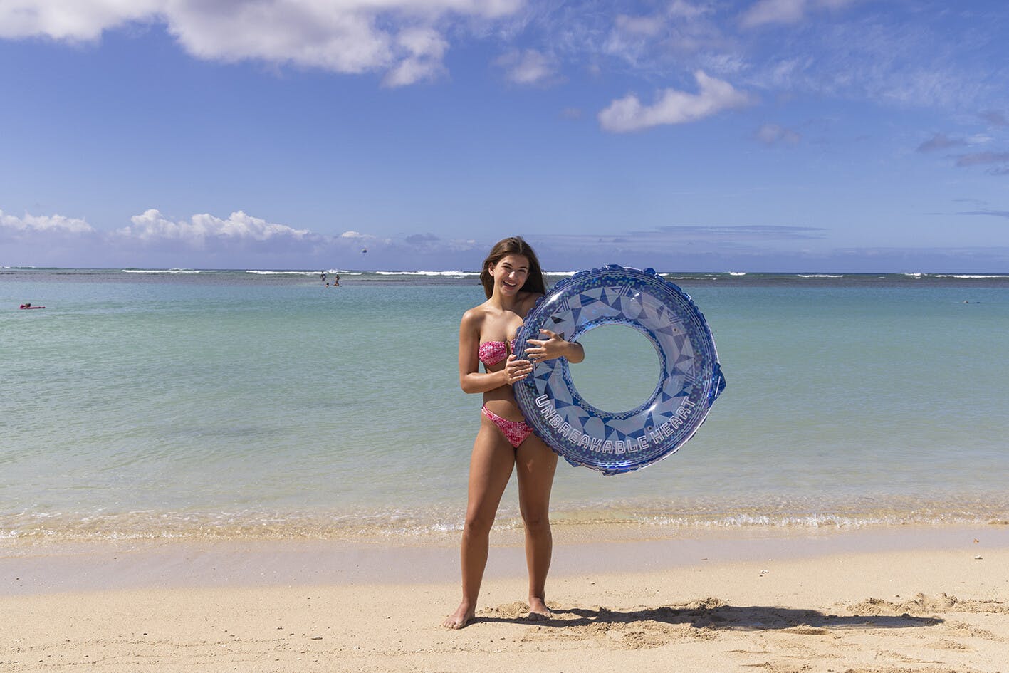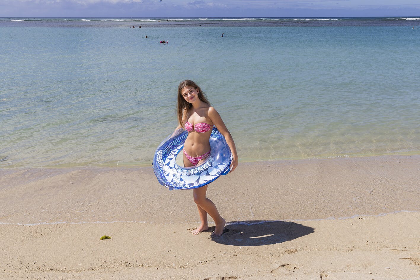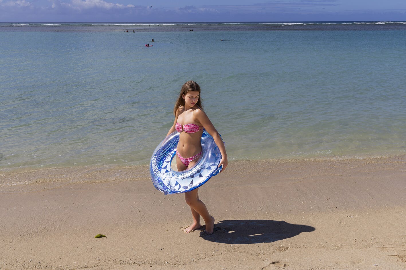 膨らんだ状態の浮輪の内周が約110~115センチの浮輪です。男女問わず大人1人が入れる大きさです。かんたん空気栓装着商品。ロープ付