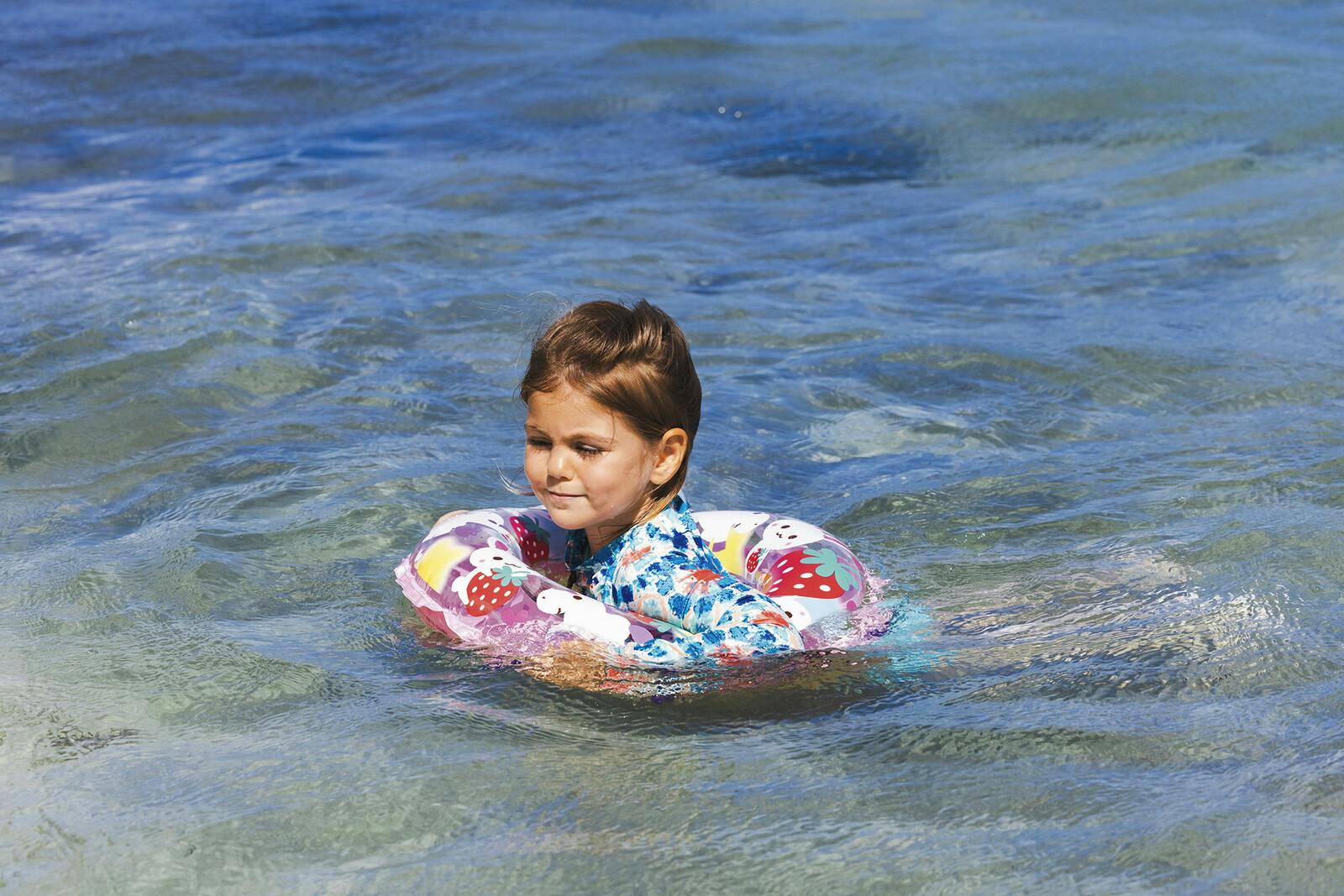 対象年齢3歳~5歳くらいのお子様に最適!。膨らんだ状態のウキワの内周は約70~75cmです。ロープ付き。かんたん空気栓装着商品