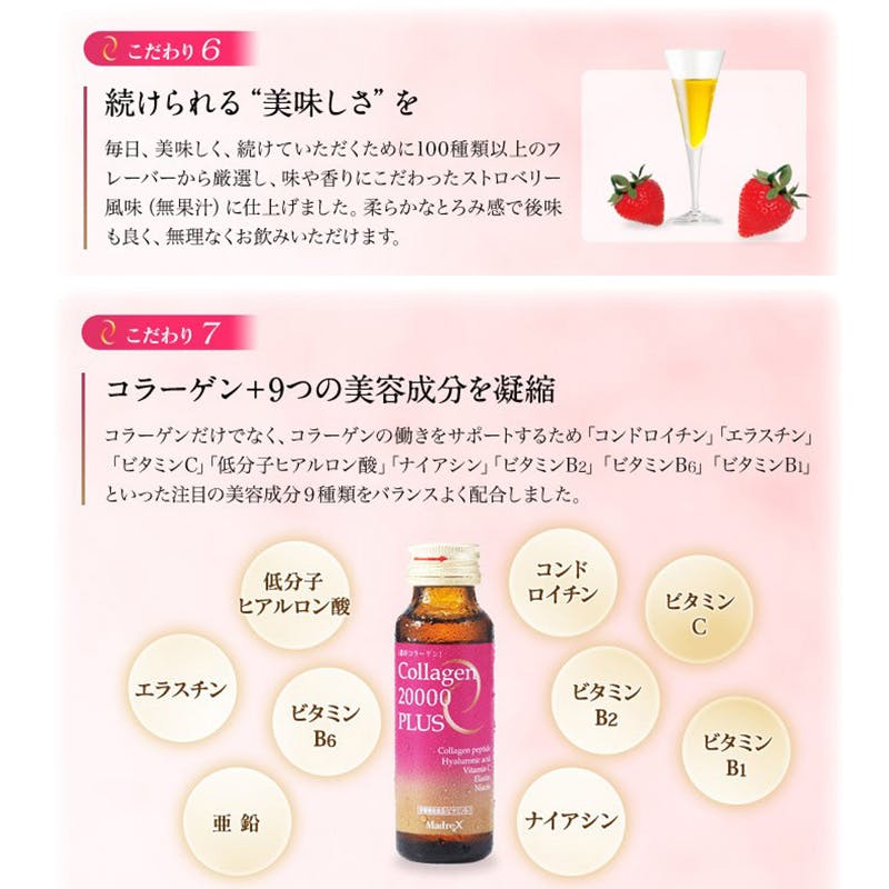 フィッシュコラーゲンペプチド(ゼラチンを含む、国内製造)、コンドロイチン含有エイ軟骨抽出物、加水分解エラスチン/酸味料、香料、ビタミンC、ヒアルロン酸、甘味料(アセスルファムK、スクラロース)、グルコン酸亜鉛、ナイアシン、グレープフルーツ種子抽出物、ビタミンB2、ビタミンB6、ビタミンB1