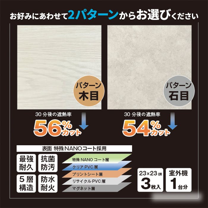 室外機の上に置けば、高い遮熱率で節電・節約対策!全面マグネットで設置が簡単な、室外機用遮熱シートです。置くだけで取付け完了!カッターなどでサイズカットしてお使いいただけます。「石目」パターンはモダンな外観やシンプルがお好みの方に。