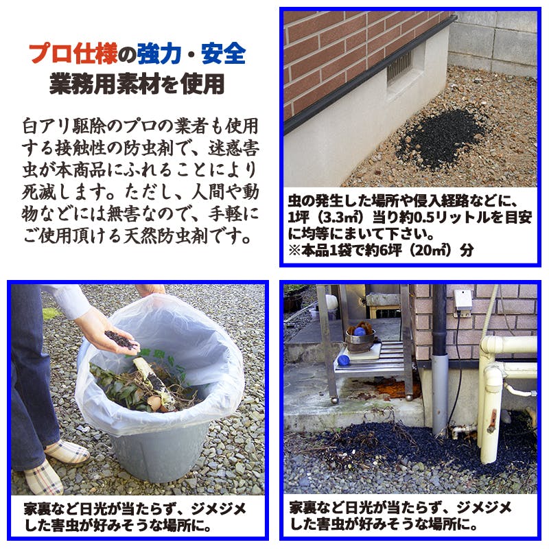 虫の発生した場所や侵入経路などに、1坪(3.3m2)当り、約0.5Lを目安に均等にまいて下さい。※本品1袋で約6坪(20m2)分