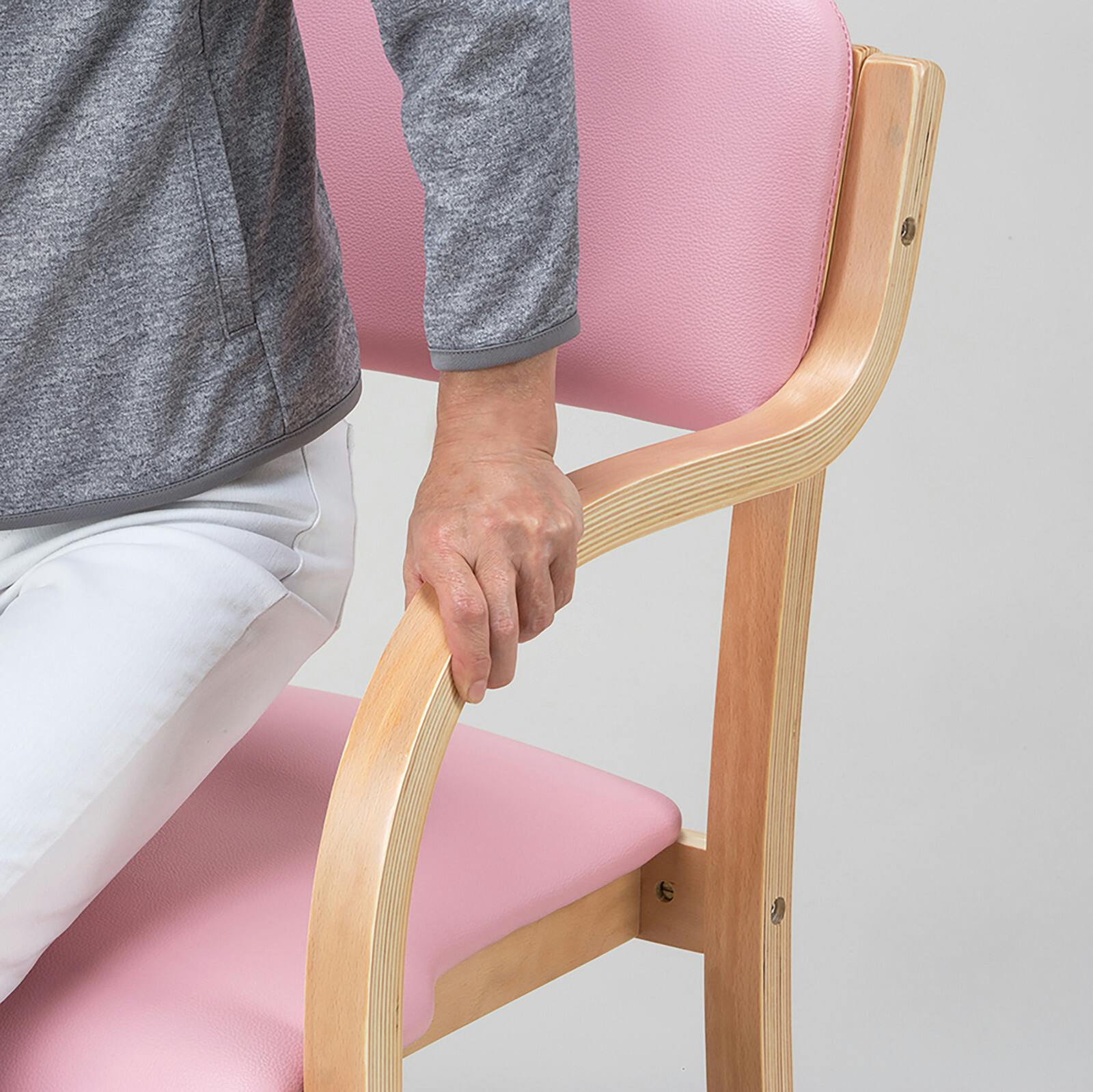 立ち座りを優しくサポートする肘掛け付き椅子。●オフィスの休憩スペースや福祉施設など業務用としても大活躍。●安定性に優れた弓型状。安定性に配慮し、上からの圧力が分散するように設計。●4脚までスタッキングできます。●肘フレームが座面と水平の高さで、椅子から立ち上がる際の負担を緩和させる設計です。●手のひらへの違和感が少ないアール加工。座面は前に垂れた疲れにくい形状。脚底にキズ防止用パーツ付き。汚れもサッと拭きとれる合成皮革使用。