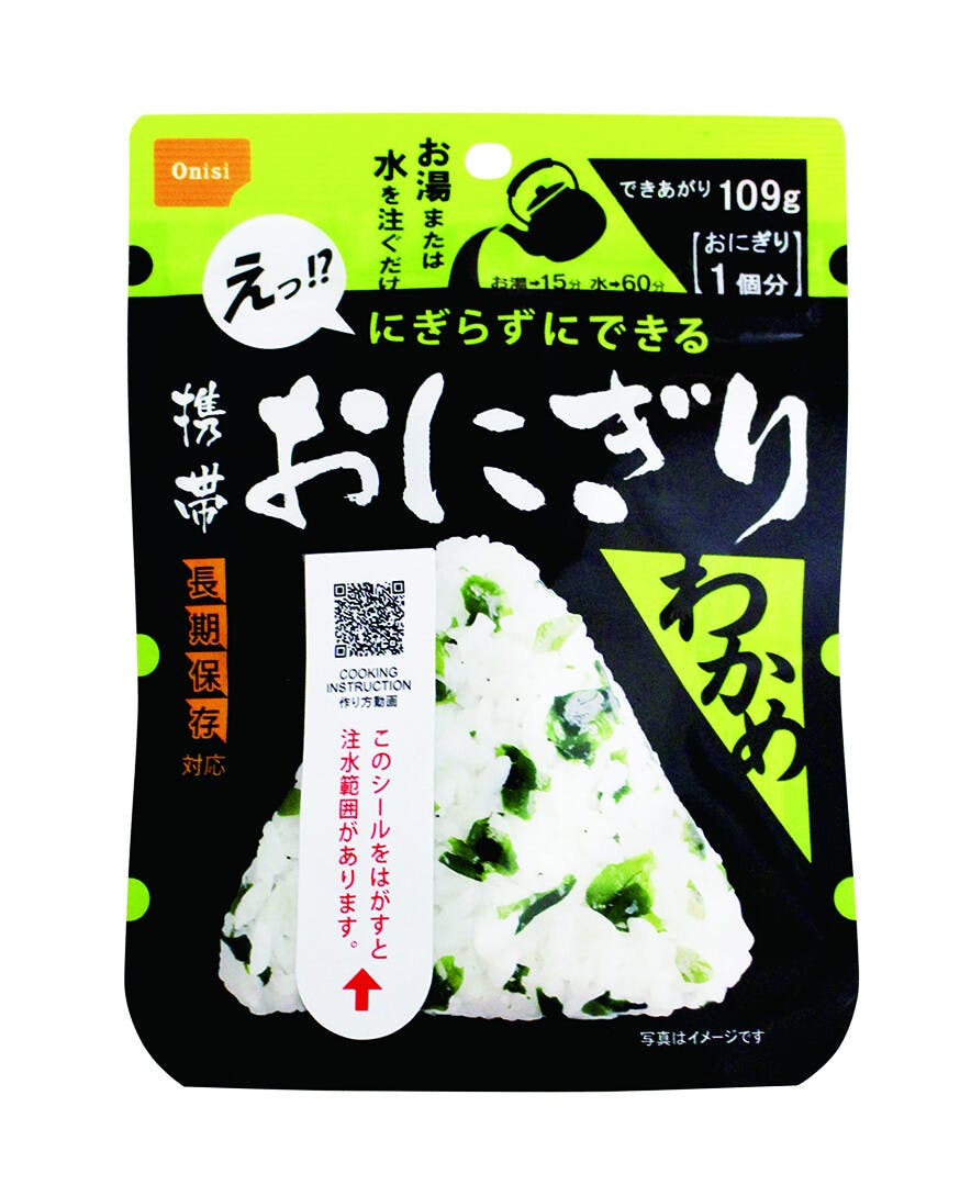 水でも復元できる携帯おにぎり●5年常温保存の美味しいおにぎり。●100%国産米を使用したお湯または水を入れるだけでできる三角形の携帯おにぎり。●3点カット方式採用(実用新案第3197867号)●手を汚さずに作って食べられる衛生的でめずらしい人気商品です。●鮭の旨味が染み出る「鮭味」磯の風味が美味しい「わかめ味」、しいたけやごぼうの旨味が人気の「五目おこわ」の3種のお買得セット。●賞味期限:製造日より1825日●保存方法:常温●開封後保存方法:高温多湿を避け冷暗所に保存●原産国:日本●加工地:日本