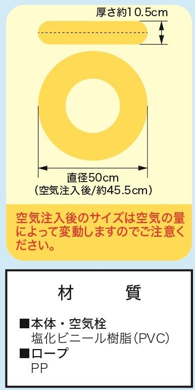 本体:50cm/本体内周(空気注入後):70~75cm/パッケージサイズ:W18×L26.5×T2cm