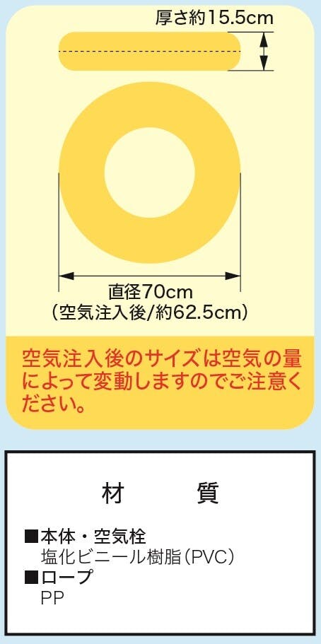 本体・空気栓:塩化ビニール(PVC)/ロープ:ポリプロピレン(PP)