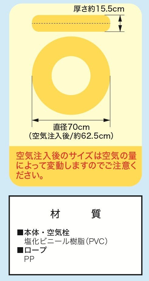 本体:70cm/本体内周(空気注入後):95~100cm/パッケージサイズ:W24×L34×T2cm