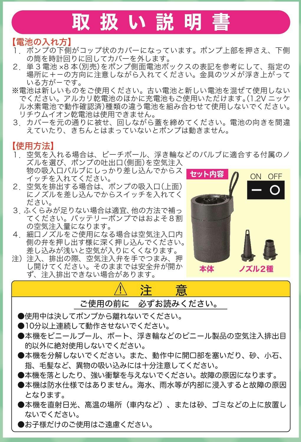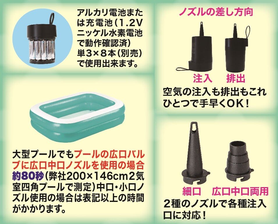 浮輪やビニールプールの空気注入や排出の際に便利な電動ポンプです。単3電池×8本(別売り)に対応した商品の為、外出時での使用に大変便利です。(1.2Vニッケル水素電池でも動作確認済み)2種類のノズルがついており、浮輪、プールとカバーできます。空気注入時間の目安200×146cm 当社規格四角プール広口バルブ使用の場合:約80秒圧力:0.5Psi電動ポンプ、持ち運び、電池、バッテリーポンプ、単3電池、浮輪、ボールプール、便利
