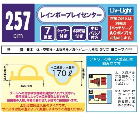 サイズの表記は目安となっております。 空気の量やビニールの伸縮によりサイズが異なります。 ホースは内径15mmの物を別途ご用意ください。