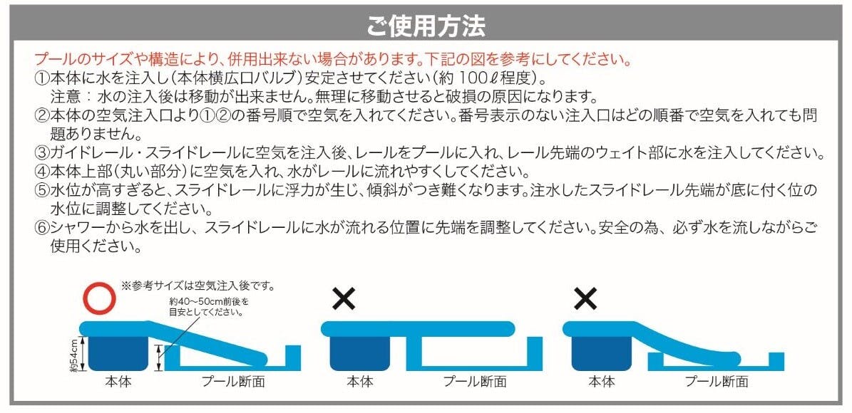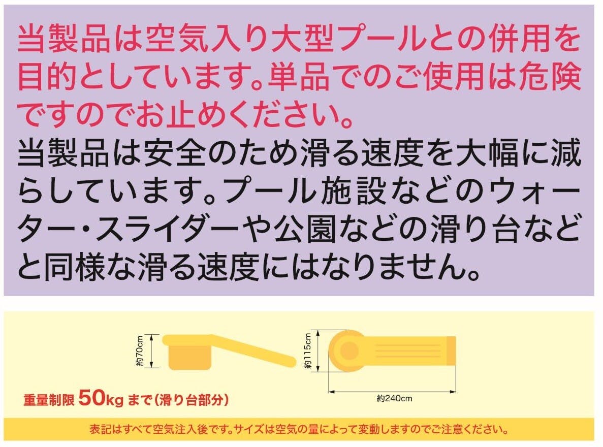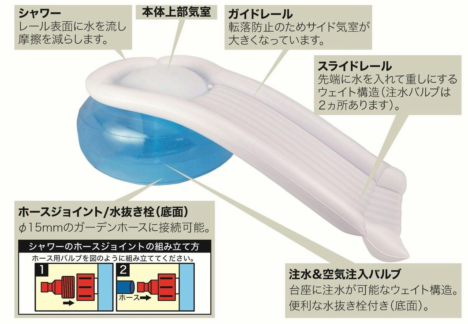 対象年齢:3歳以上家庭用プールと合わせてご使用いただく、大型滑り台です。底に水を入れて重りにして使用してください。推奨は3m四角プールですが、それ以外のサイズでもご使用いただけます。ご家庭用ホースをノズルに繋いでいただき、水を流しながら遊んで下さい。水がないと滑りにくい構造となっております。単調になりがちなプール遊びも、遊びの幅が広がります。4気室・シャワー付きプール、プール遊び、シャワー、家庭用プール、楽しみ、滑り台、スライダー
