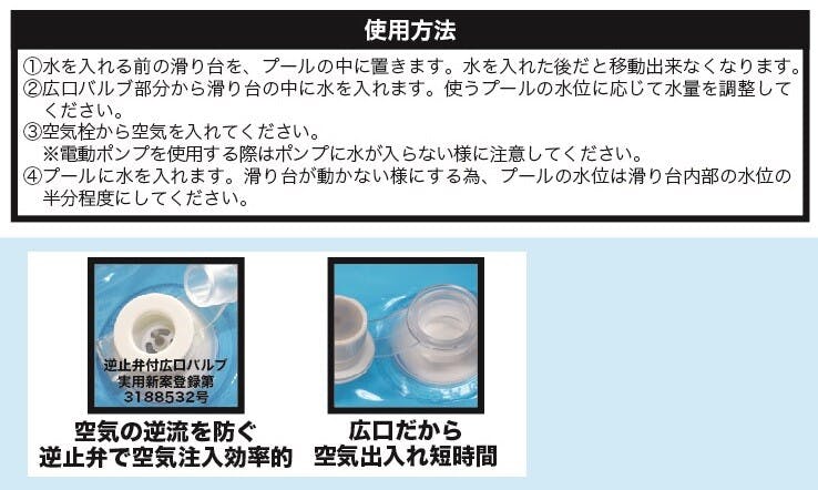対象年齢:3歳以上ベビー向けのプールや底浅プールなどにおすすめのミニ滑り台です。ベビー向けですので、一般の滑り台とは遊び方が異なりますのでご了承下さい。先に水を入れて重りにしてから、空気を入れて調節します。室内でご使用の際は水を入れなくても使用ができます。単調になりがちなプール遊びも、遊びの幅が広がります。1気室プール、プール遊び、滑り台、室内